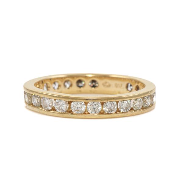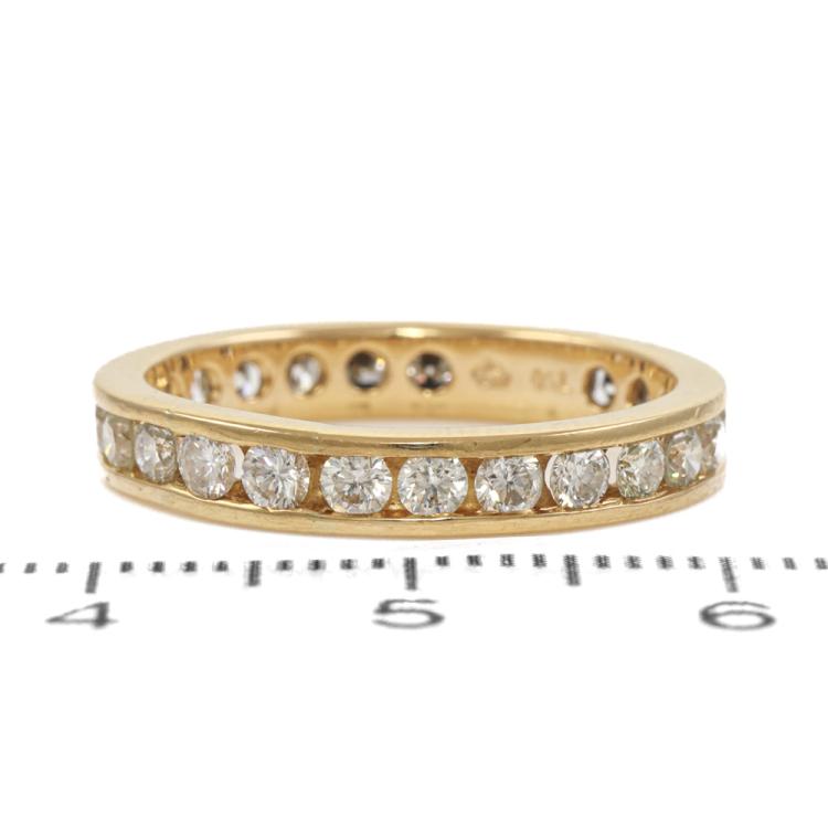Diamond full loop eternity ring with 25 channel set round Natural Diamonds totalling approximately 1.50ct (Estimated grading: G-H SI). 18ct yellow gold. Ring size: O - ring resizing is not recommended. Band width: 3.5mm. Weight: 3.4g. (Pre Owned)