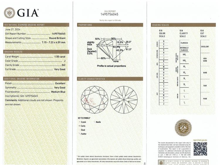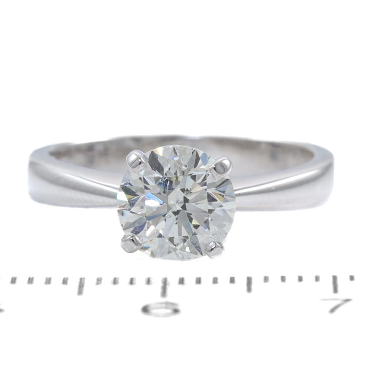 Diamond solitaire ring with round brilliant cut Natural Diamond of 1.50ct (with GIA Report graded as J SI2 #1495756045 ). 18ct white gold. Ring size: L½. Band width: 3.4mm - 2mm. Weight: 4.7g. (New)