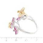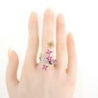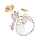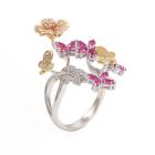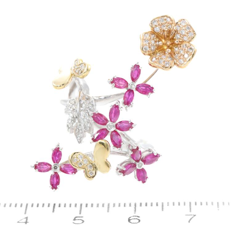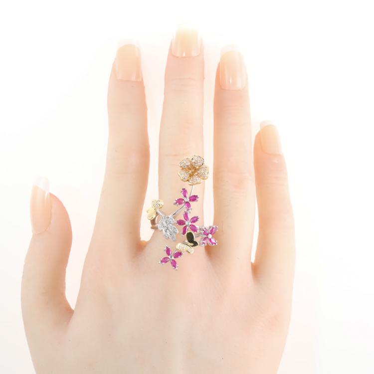 Flower and Butterfly design open ring with marquise cut Natural Rubies totalling 1.50ct and round Natural Diamonds totalling 0.30ct (Estimated grading: H SI). 18ct white, yellow & rose gold. Ring size M. Width: 3mm-2mm. Weight: 9.7g. (Pre-owned)