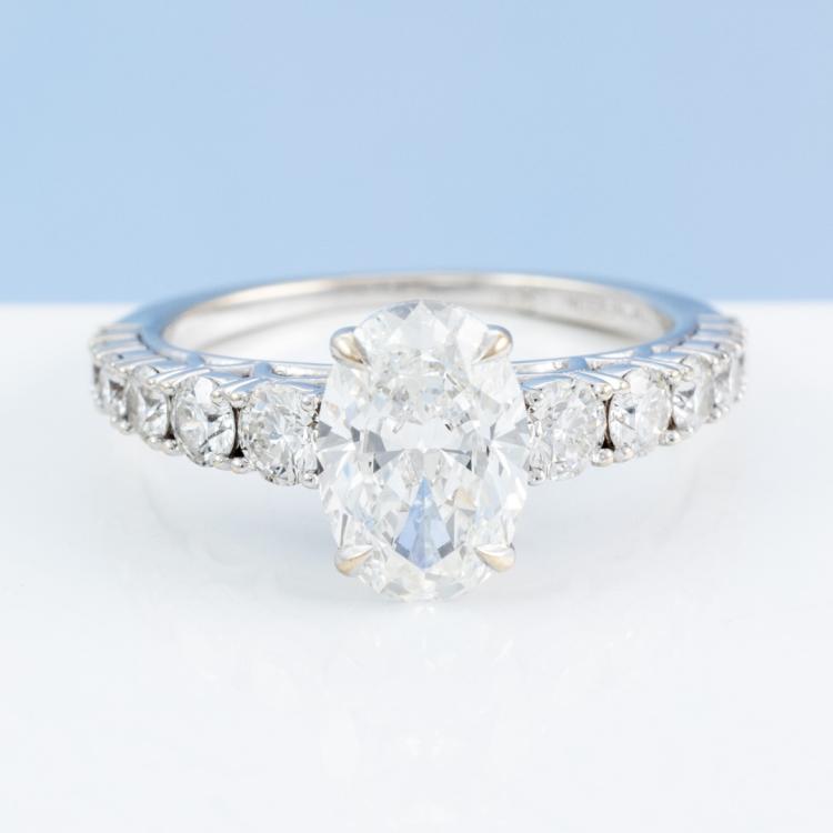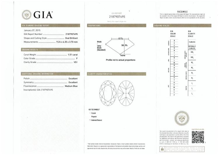 Diamond Solitaire ring with a centre oval shape Natural Diamond of 1.51ct (with Copy of GIA Report graded as F VS1 #2187907495) and round Natural Diamonds totalling 0.74ct (Estimated graded as G-H SI1). 18ct white gold. Ring size J. Band width: 1.1mm - 1.5mm. Weight: 3.3g. With Valuation ##000018019002. Note: The wight of the ring differs from what is stated on the Valuation Certificate may due to resizing. (Pre-owned)