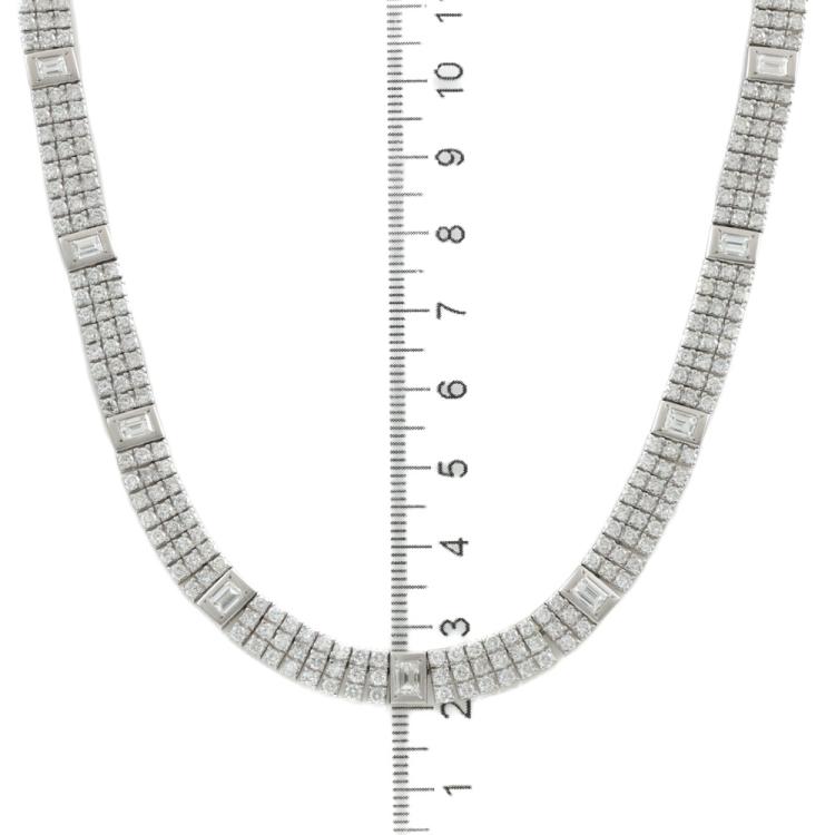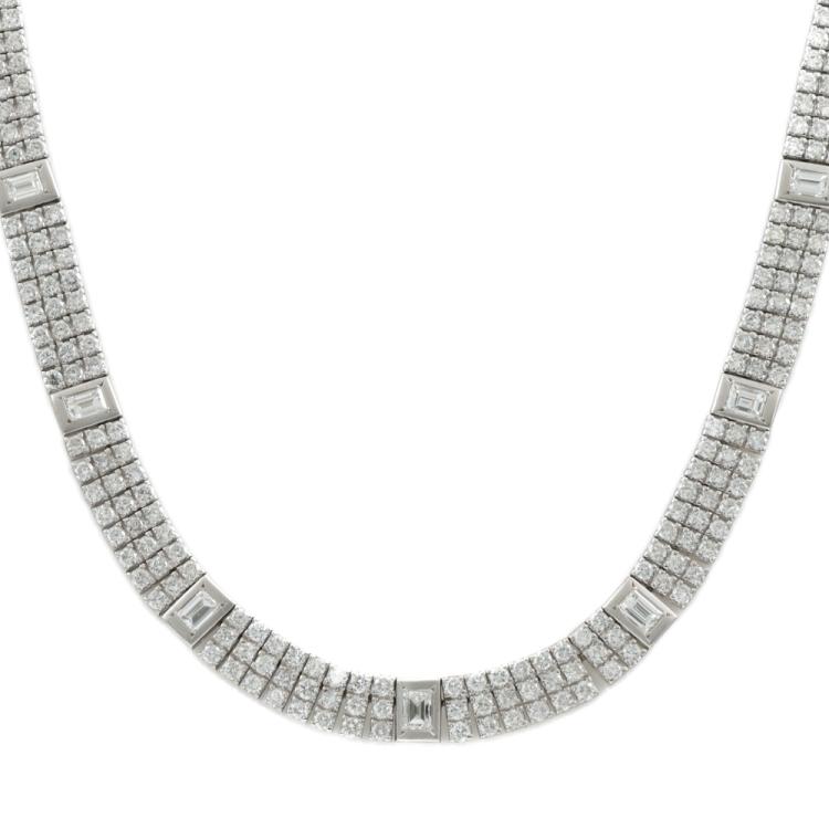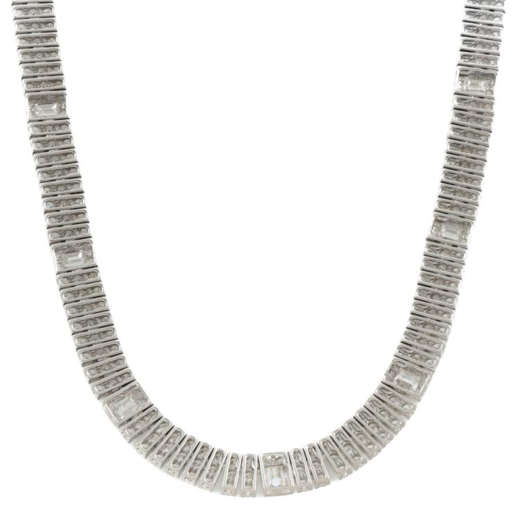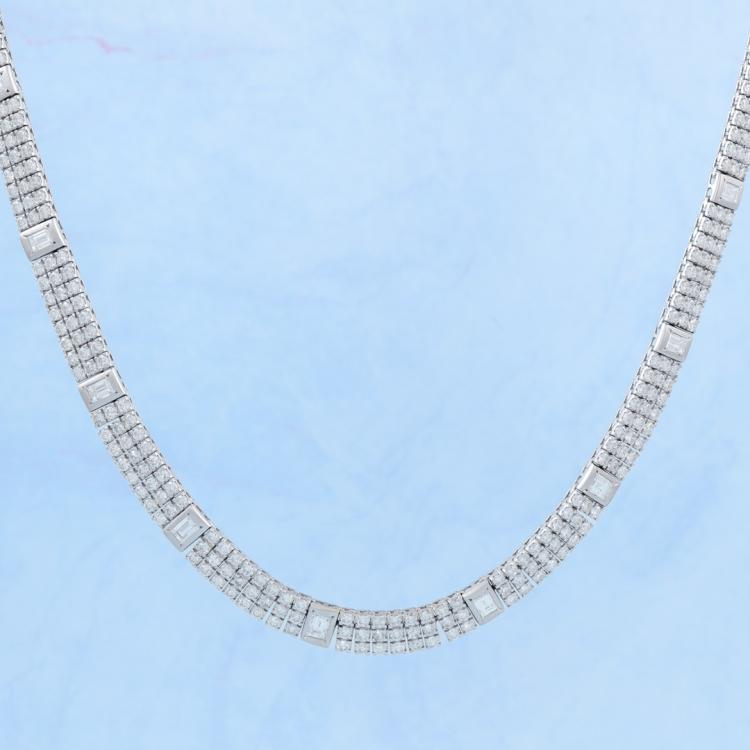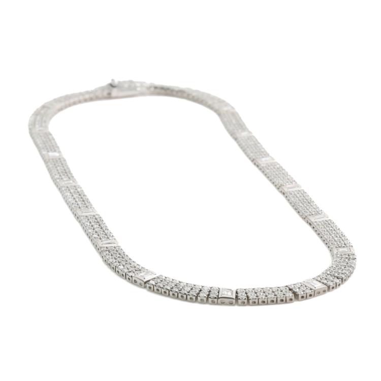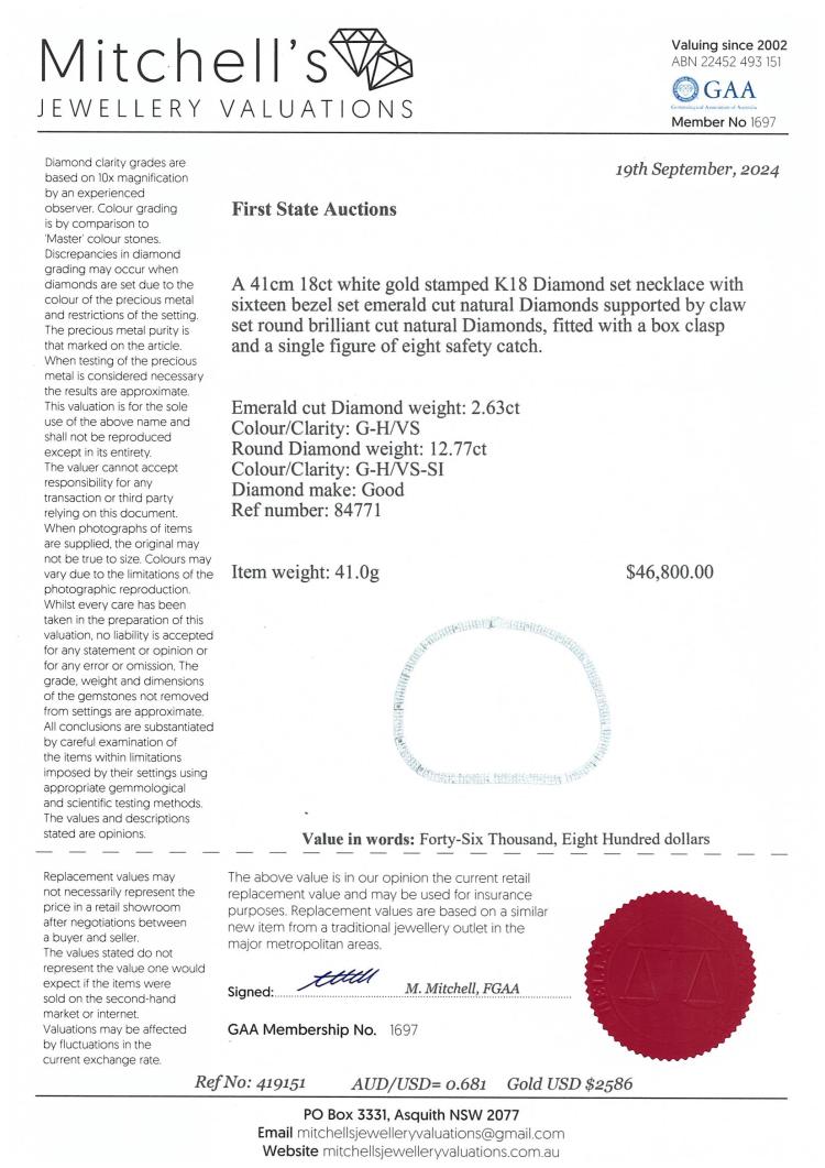 Diamond necklace with 16 emerald cut Natural Diamonds totalling 2.63ct (Estimated grading: G-H VS) with a mat surrounding finish and round Natural diamonds totalling 12.77ct (Estimated grading: G-H VS-SI). 18ct white gold. Length: 41.0cm. Weight: 41.0g. With Valuation Certificate #419151. (Pre-owned)