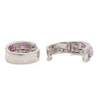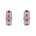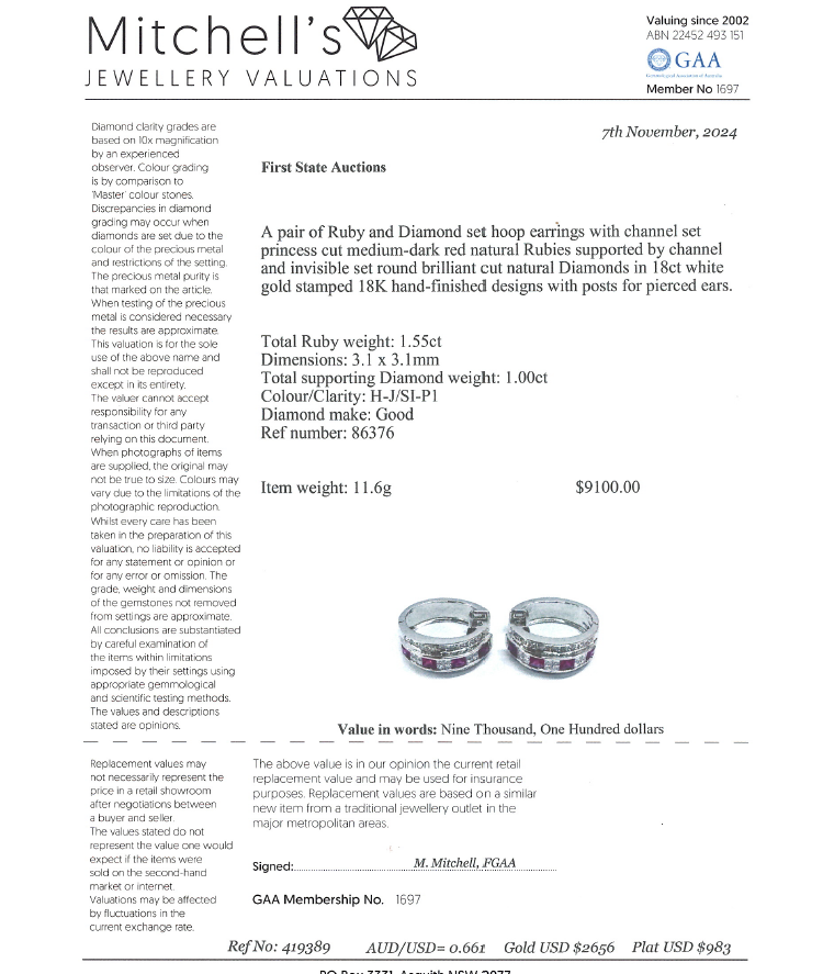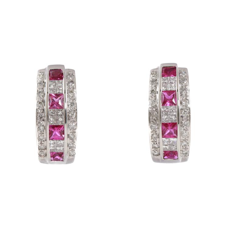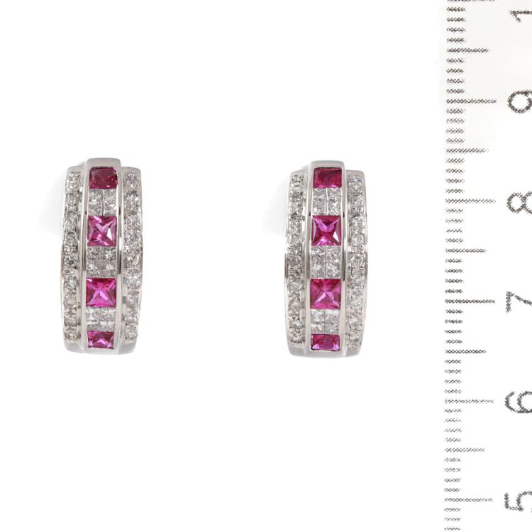 Ruby and Diamond huggie hoop earrings with princess cut Natural Rubies totalling 1.55ct and Natural Diamonds totalling 1.00ct (Estimated grading: H-J SI-P1). 18ct white gold. Weight: 11.6g. With Valuation Certificate #419389. (Pre-owned)