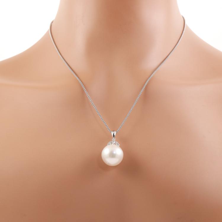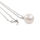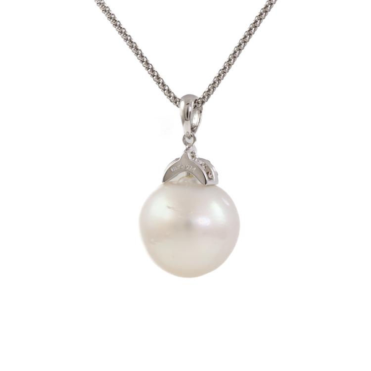 Pearl and Diamond pendant with button shape South Sea Pearl of 15.9mm and round Natural Diamonds totalling 0.14ct. 18ct white gold with Platinum - 850 adjustable 61cm chain. Weight: 11.4g. (Pre-owned)