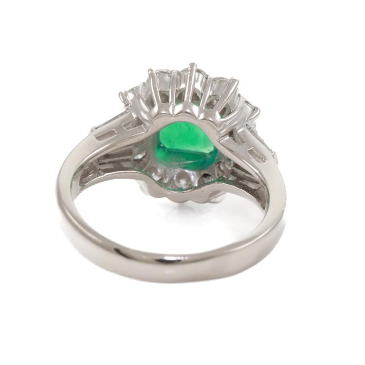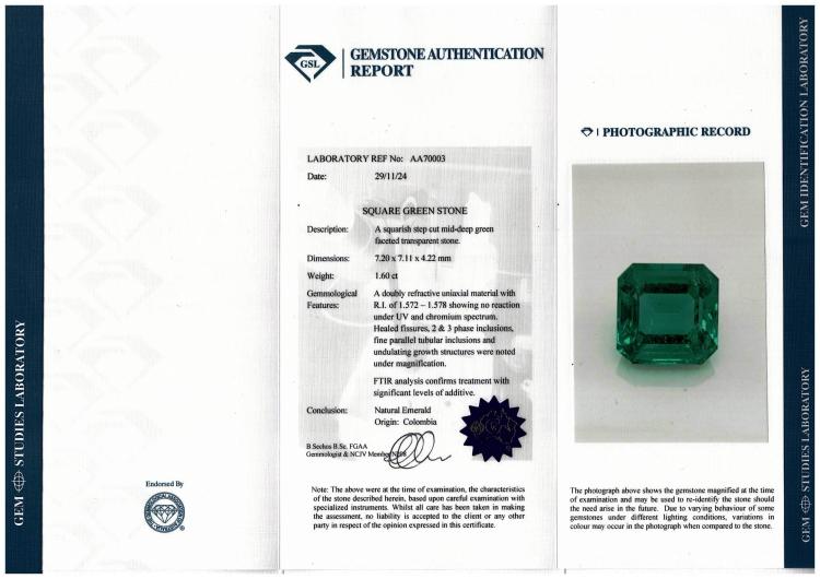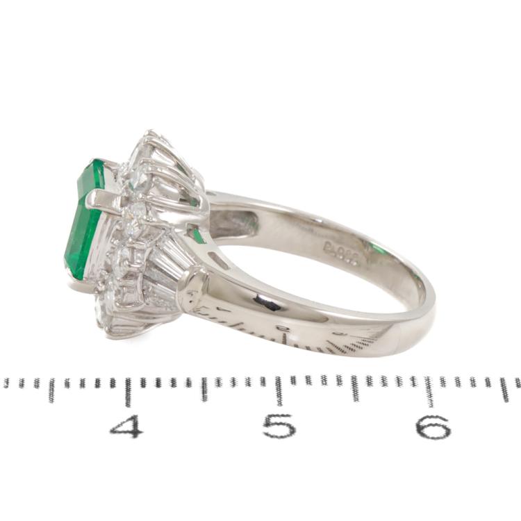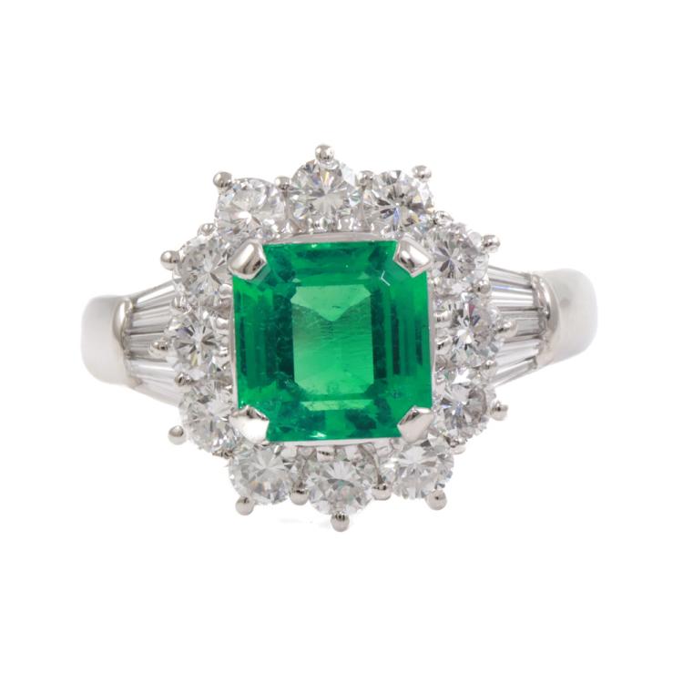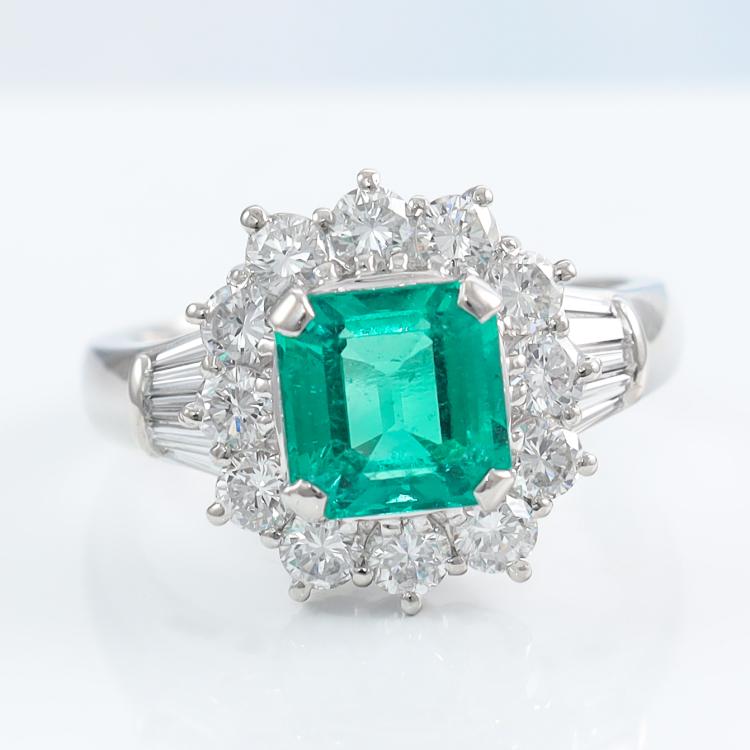 Emerald and Diamond ring with square emerald cut Natural Colombian Emerald of 1.60ct (With GSL Report #AA70003. Origin: Colombia) and round & baguette cut Natural Diamonds totalling 1.27ct (Estimated grading: H-I VS-SI). Platinum - 900. Ring size: K½. Band width: 2.6mm - 3.7mm. Weight: 9.0g. With Certificate #419426. (Pre-owned)