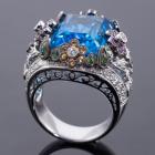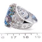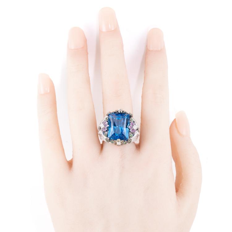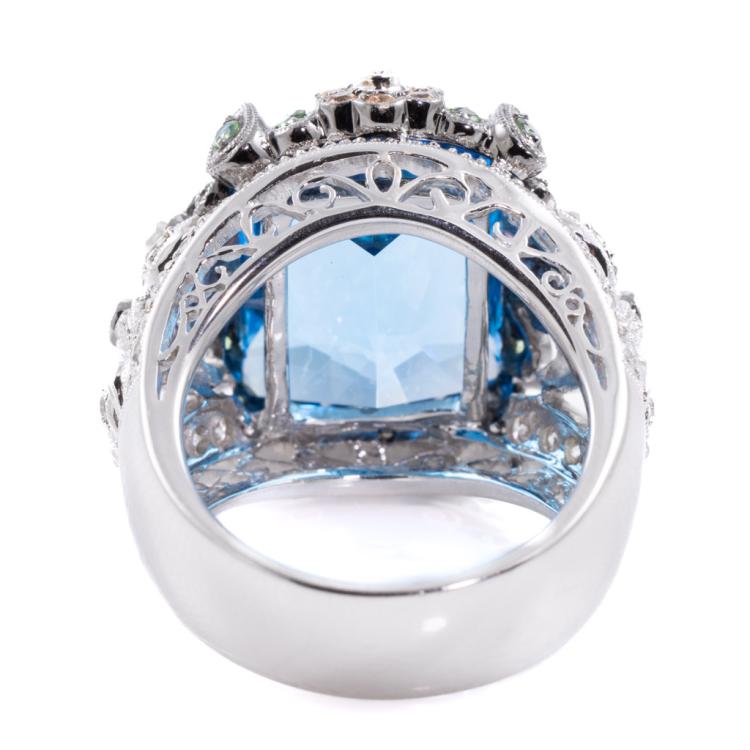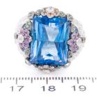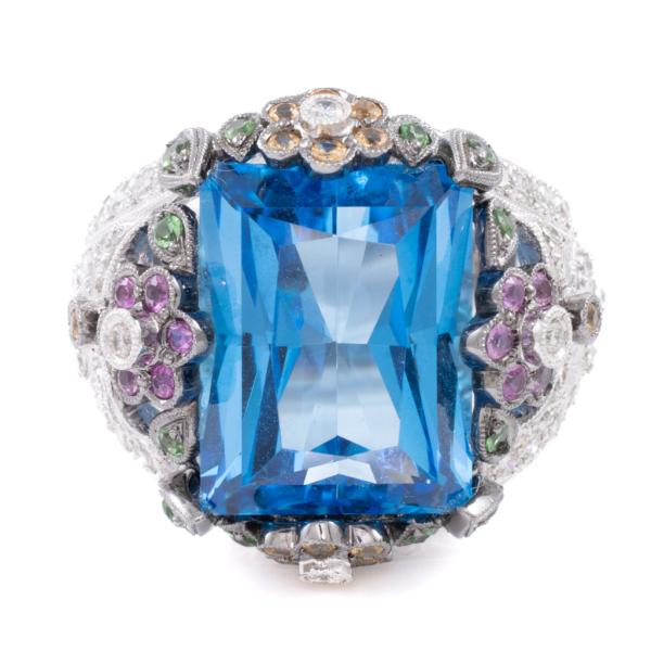 Topaz, Sapphire & Diamond ring with rectangular shape Natural Topaz of 16.35ct, round mixed colour Sapphire totalling 0.75ct and round Natural Diamonds totalling 0.77ct (Estimated grading: K-L SI). 18ct white gold. Ring size M 1/2. Band width: 9.7mm - 6.6mm. Weight: 19.2g. (Pre-owned)