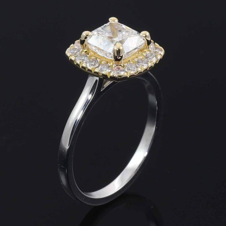 Diamond halo ring with centre cushion cut Natural Diamond of 1.70ct (with GIA Report graded as E SI1 #1425609051) and surrounding round Natural Diamonds totalling 0.39ct (Estimated grading: G-H VS-SI). 18ct yellow and white gold. Ring size: L1/4. Band width: 1.9mm. Weight 4.8g. (New)