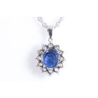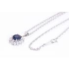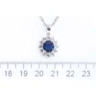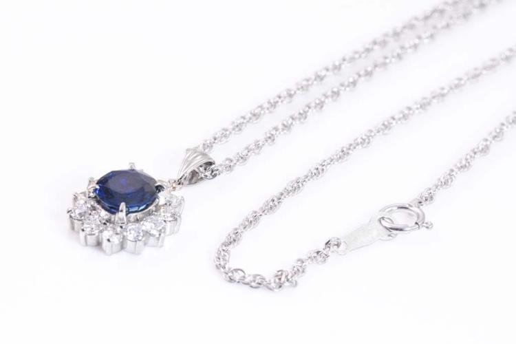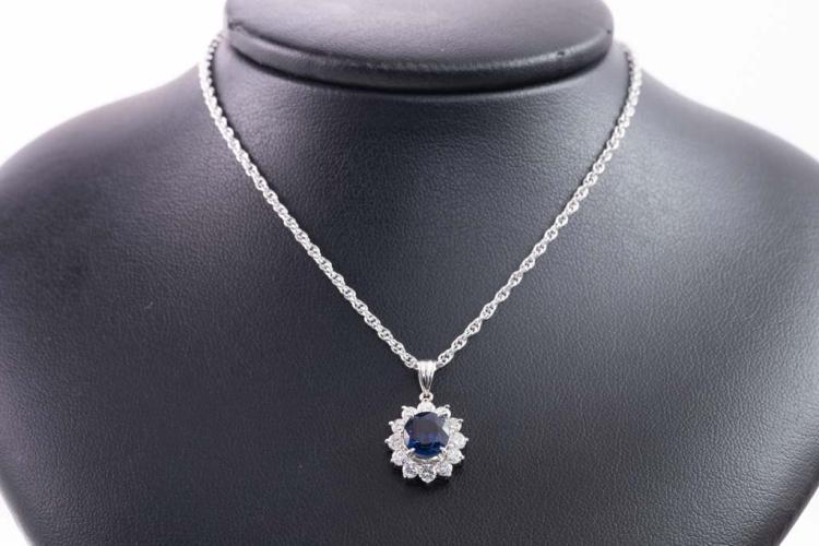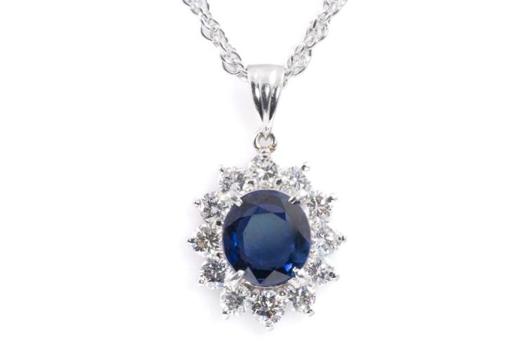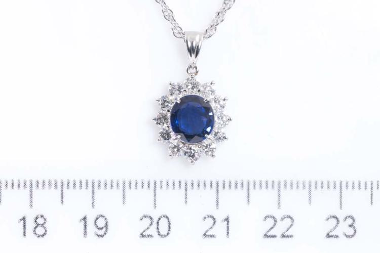Sapphire and Diamond pendant with oval shape Natural Sapphire of 1.74ct and round Natural Diamonds totalling 0.81ct (Estimated grading: G-H SI). Platinum - 900 with 39cm platinum-850 chain. Weight: 8.9g. With Certificate #417099. (Pre-owned)