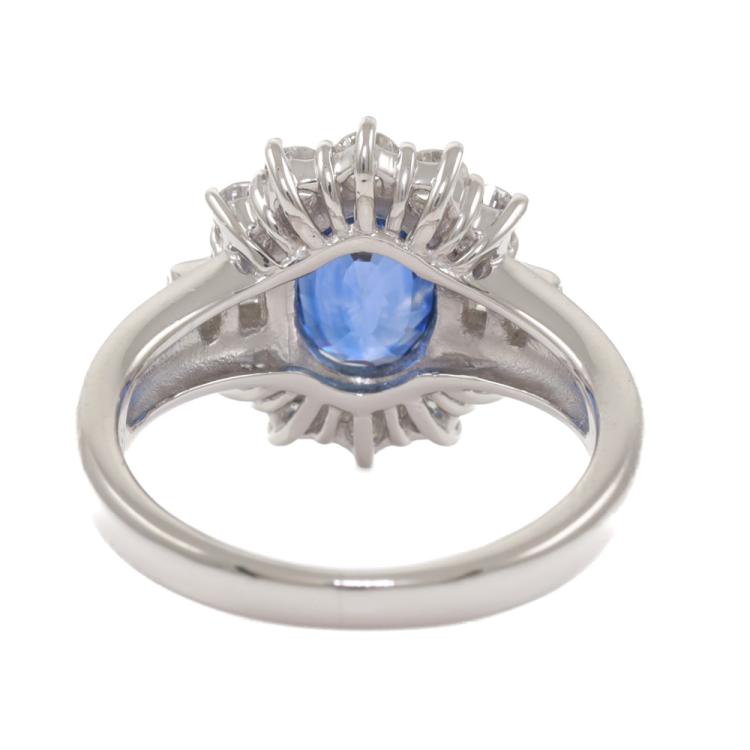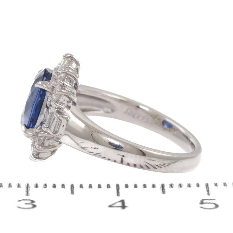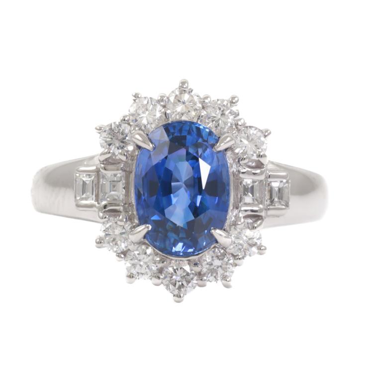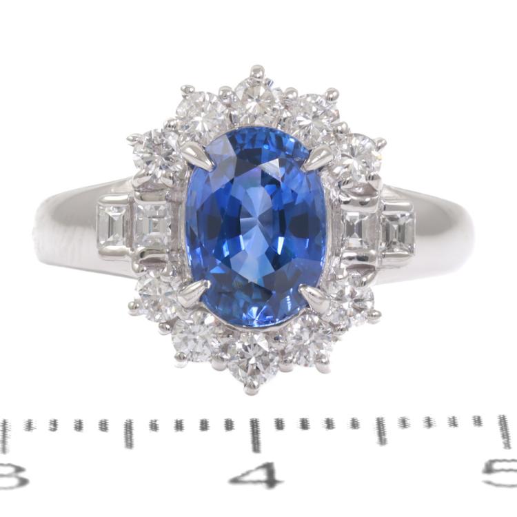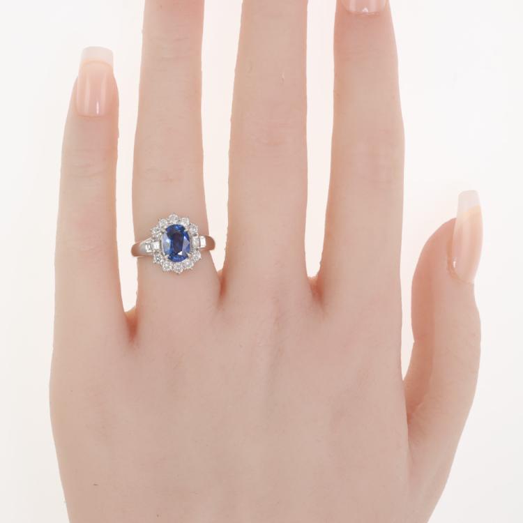 Sapphire and Diamond ring with oval shape natural blue Sapphire of 1.82ct and round & baguette cut Natural Diamonds totalling 0.56ct (Estimated grading: G-H SI). Platinum - 900. Ring size: H. Band width: 2.0mm - 4.2mm. Weight: 6.4g. (Pre-owned)