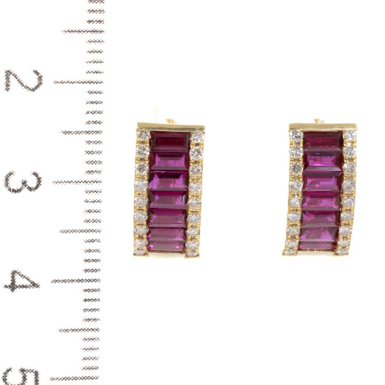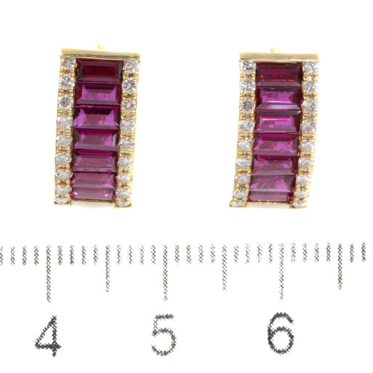 Ruby and Diamond earrings with baguette cut Natural Rubies totalling 1.84ct and round Natural Diamonds totalling 0.36ct (Estimated grading: IJ VS-SI). 18ct yellow gold. Weight: 4.7g. (Pre-owned)