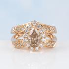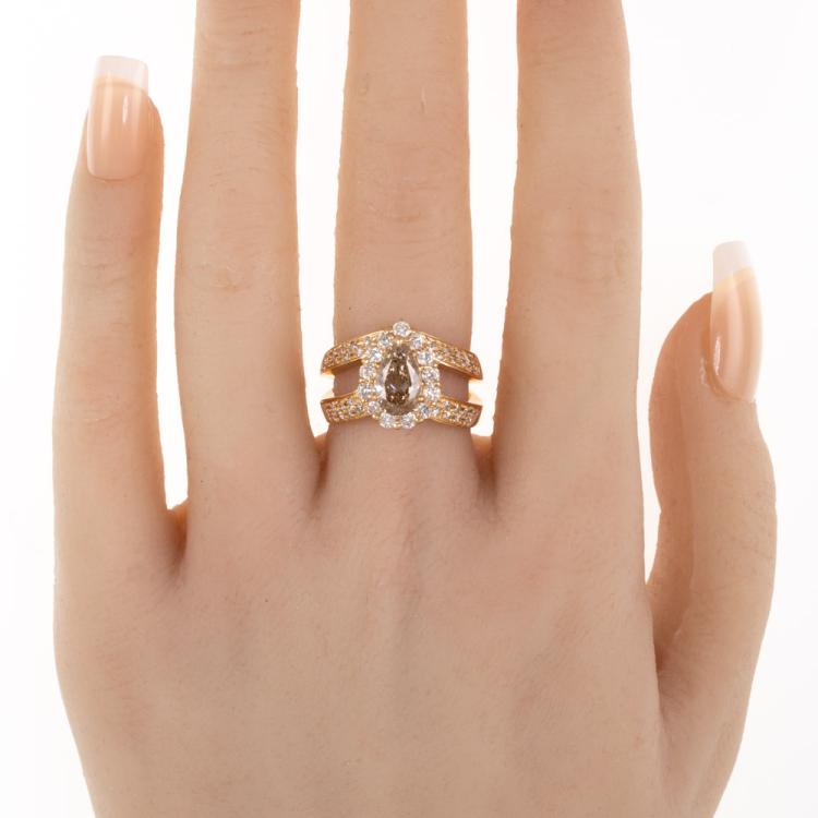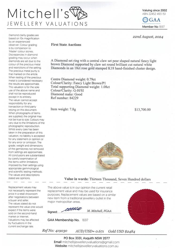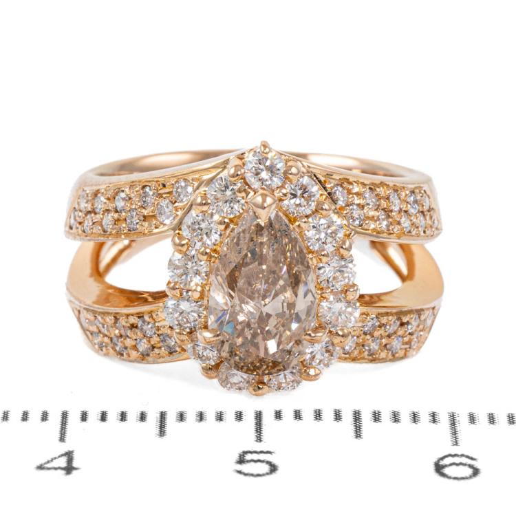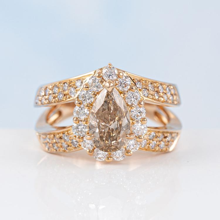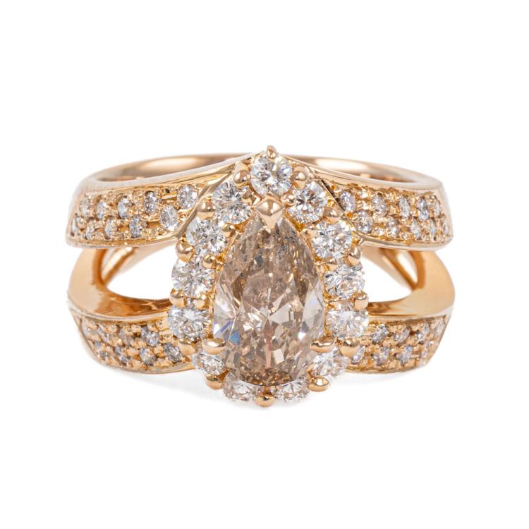 Diamond ring with centre pear shape Natural Diamond of 0.79ct (Estimated grading: Fancy Light Brown P1) and round Natural Diamond totalling 1.08ct (Estimated grading: G-H SI). 18ct rose gold. Band width: 5.0mm - 9.3mm. Ring size L 1/2 . Weight: 7.8g. With Valuation Certificate #419030. (Pre-owned)
