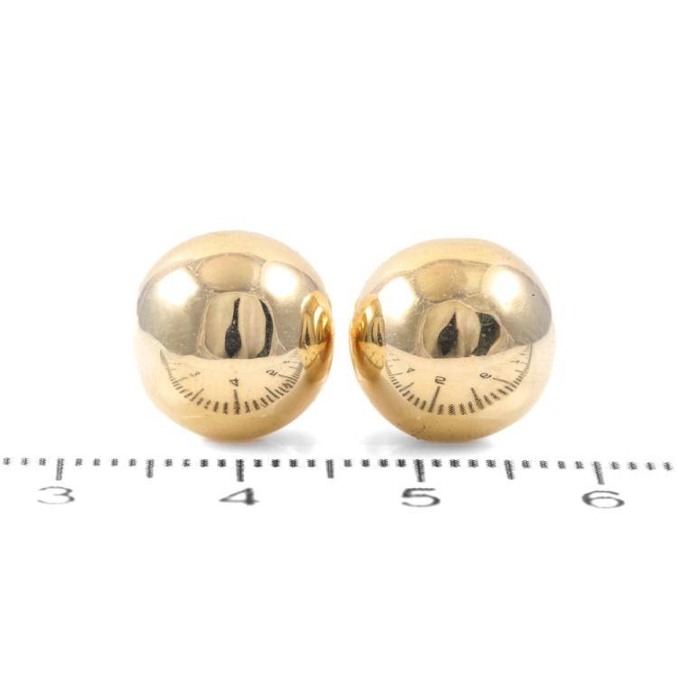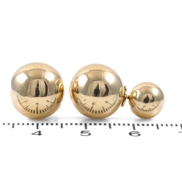 Double ball stud earrings with small ball at front earlobe and larger ball at back earlobe. 18ct yellow gold. Ball diameter: 8mm & 12mm. Weight: 5.1g. (Pre-owned)