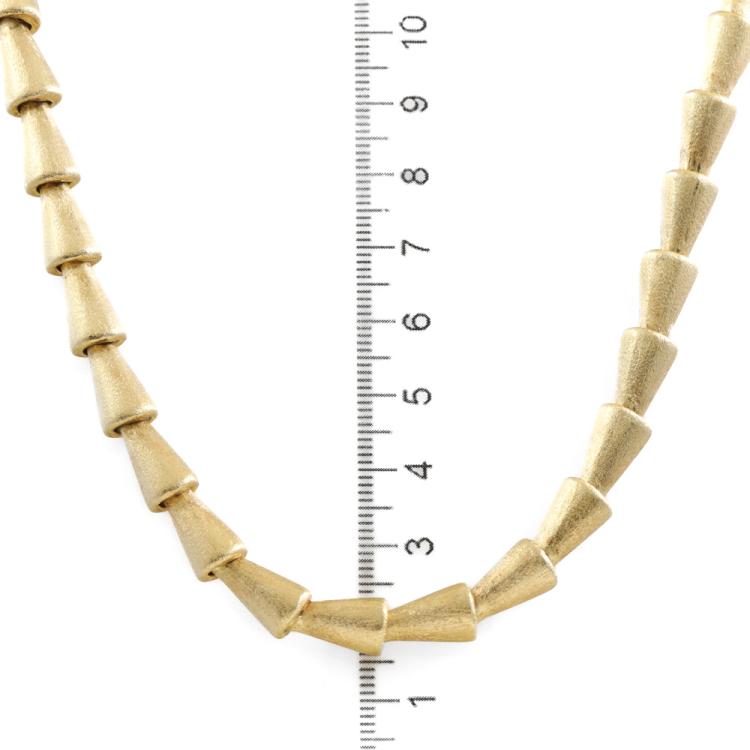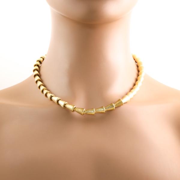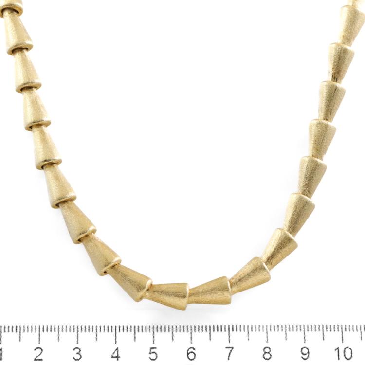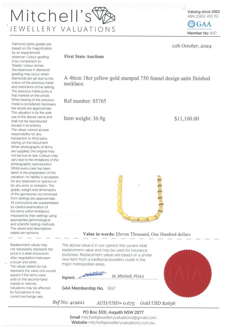 18ct yellow gold funnel design necklace. Length: 46cm. Maximum width: 7.6mm. Weight: 36.9g. With Certificate #419221. (Pre-owned)