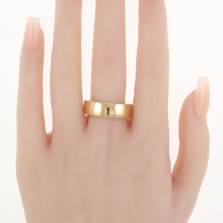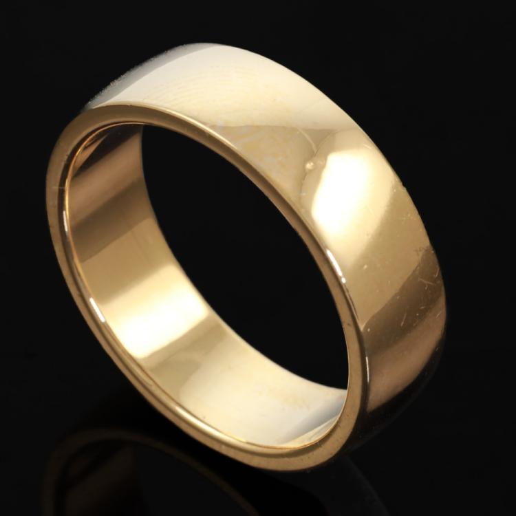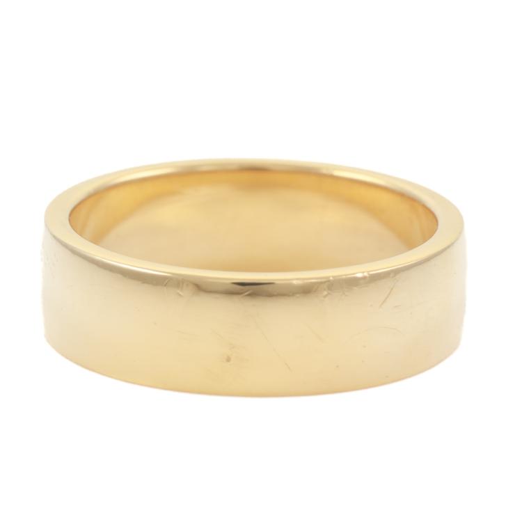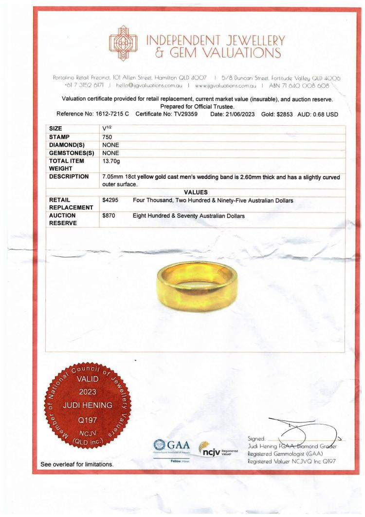 18ct yellow gold Mens band ring. Ring size: V. Band width: 7mm. Band thickness: 2mm. Weight: 13.7g. With Certificate of Valuation #TV29359 (Pre-owned)