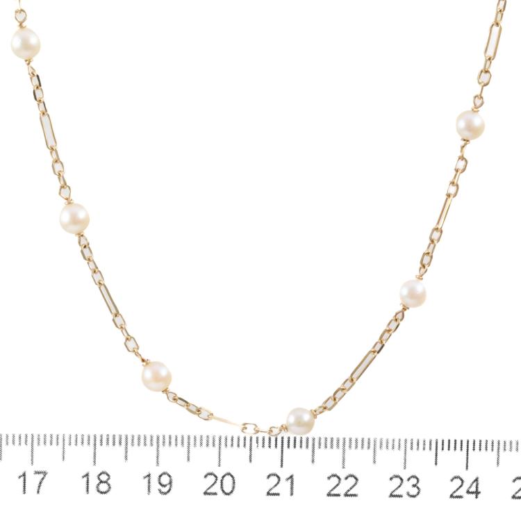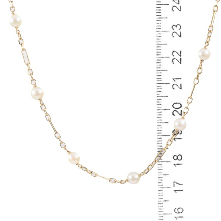 Pearl necklace with 25 cultured Pearls of 4.5-4.9mm. 18ct yellow gold with spring ring clasp. Length: 70cm. Weight: 9.7g. (Pre-owned)