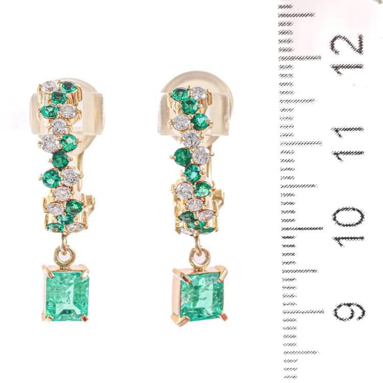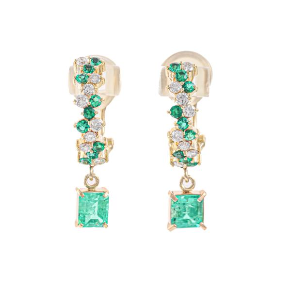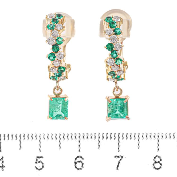 Emerald and Diamond clip-on earrings (pierced ears and non-pierced ears) with round & emerald cut Natural Emeralds totalling 1.91ct and round Natural Diamonds totalling 0.50ct (Estimated grading: H-I SI-P1). 18ct yellow gold. Weight: 6.0g. (Pre-owned)