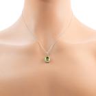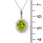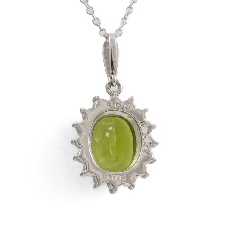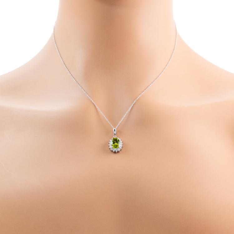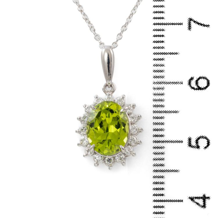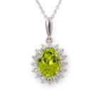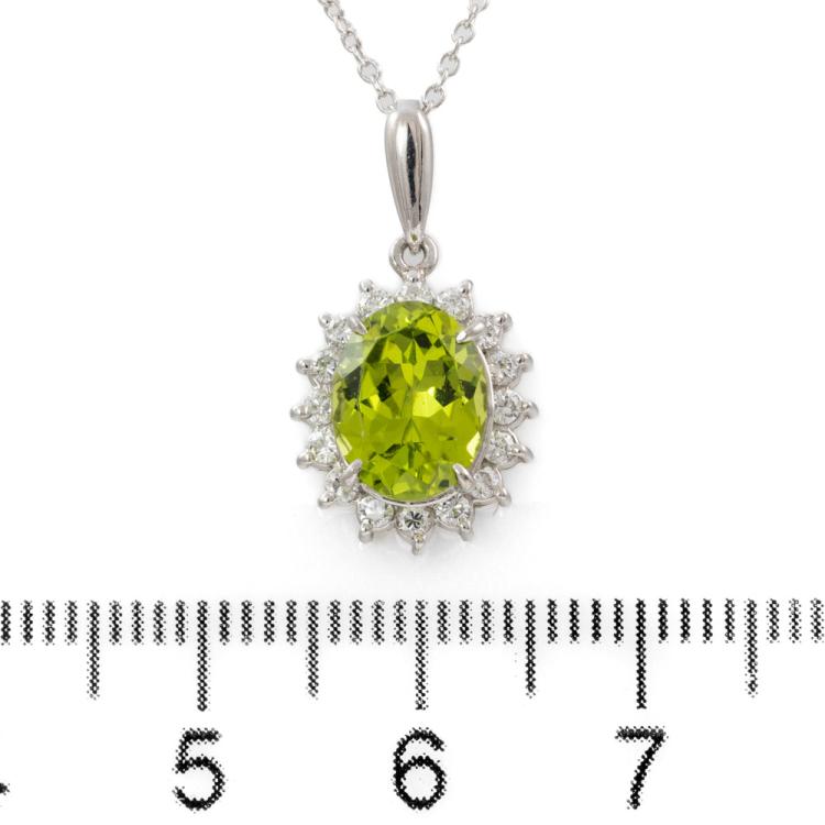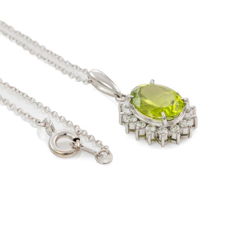 Peridot and Diamond pendant with an oval shape Natural Peridot of 1.96ct and round Natural Diamonds totalling 0.27ct. Platinum 900 with 18ct white gold 40cm chain. Weight: 3.5g. (Pre-owned)