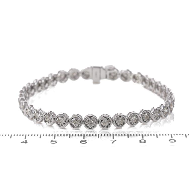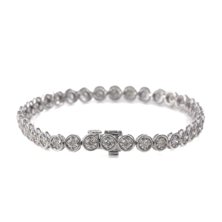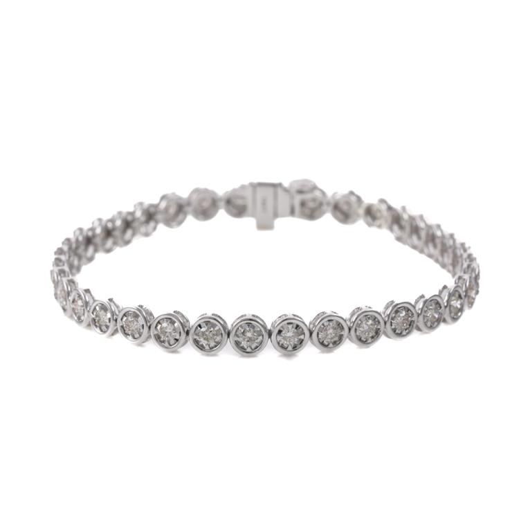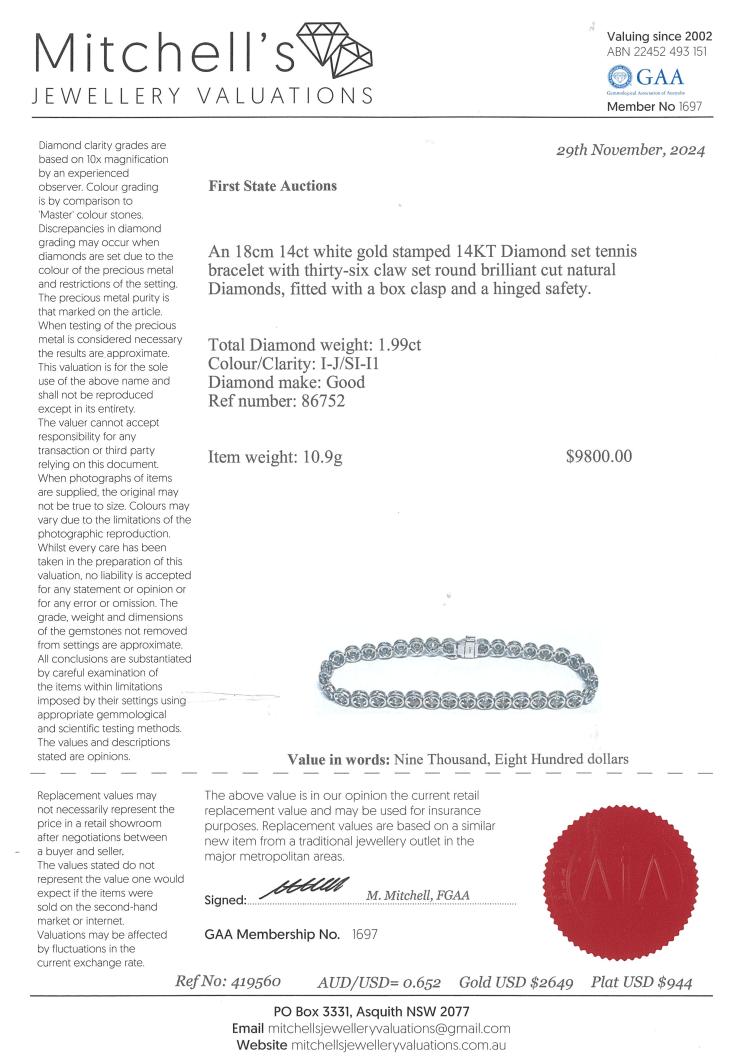Diamond tennis bracelet with 36 round Natural Diamonds totalling 1.99ct (Estimated grading: I-J SI-P1). 14ct white gold. Length: 18cm. Weight: 10.9g. With Valuation Certificate #419520. (New)