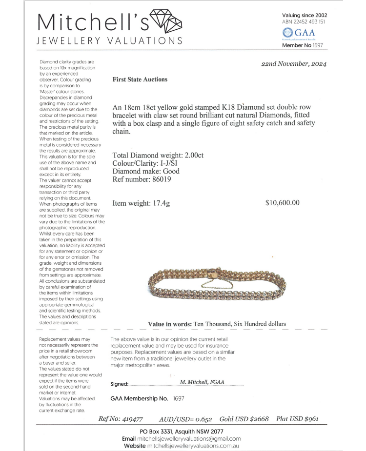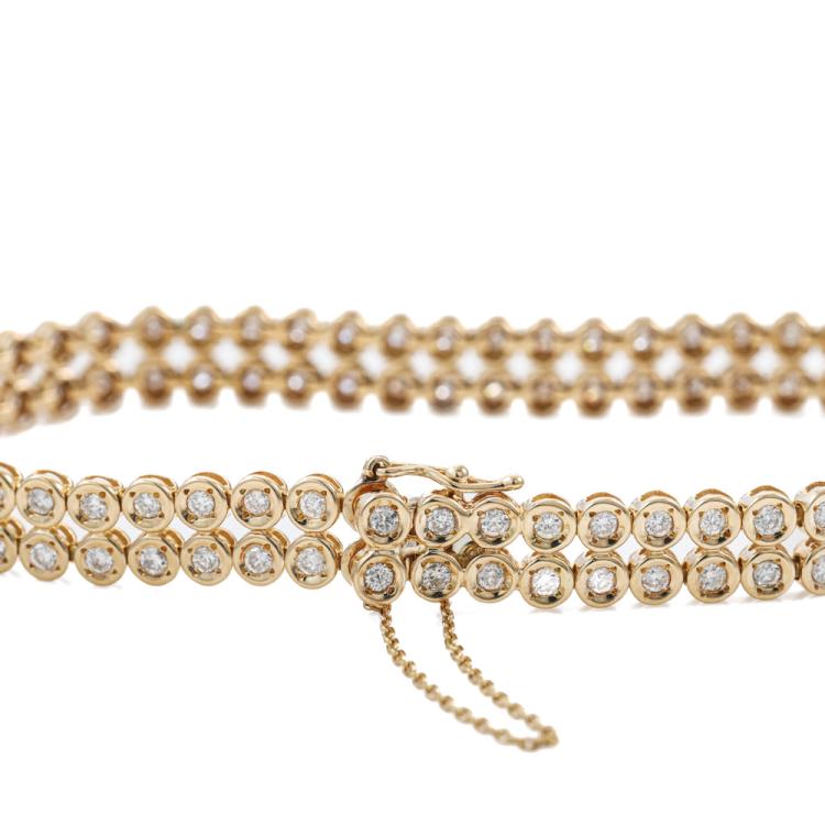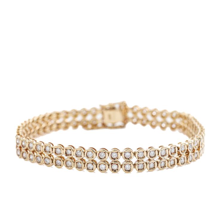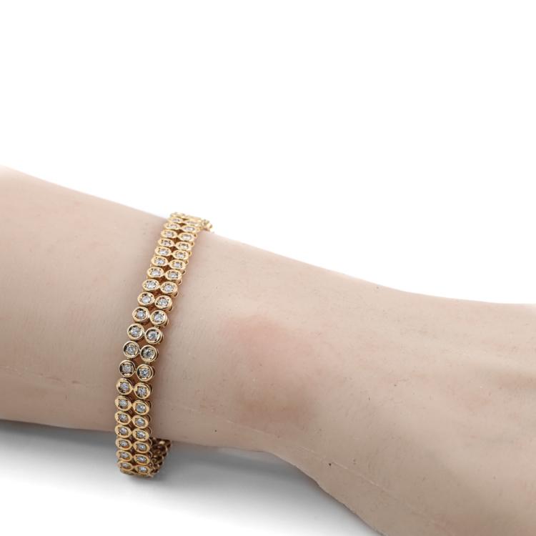 Diamond double row bracelet with round Natural Diamonds totalling 2.00ct (Estimated grading: I-J SI). 18ct yellow gold. Length: 18cm. Bracelet width: 7.2mm. With safety chain. Weight: 17.4g. With Certificate #419477. (Pre-owned)