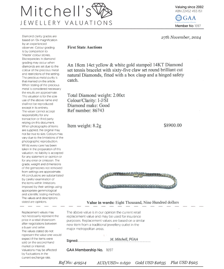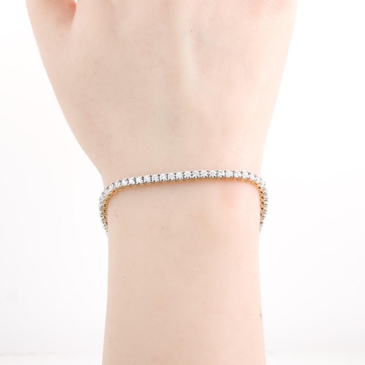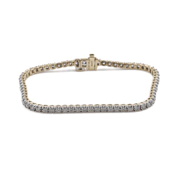 Diamond tennis bracelet with 65 round Natural Diamonds totalling 2.00ct (Estimated grading: I-J SI). 14ct yellow and white gold. Length: 18cm. Weight: 8.2g. With Certificate #419514. (New)