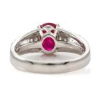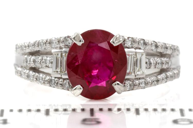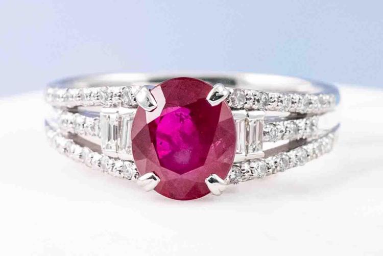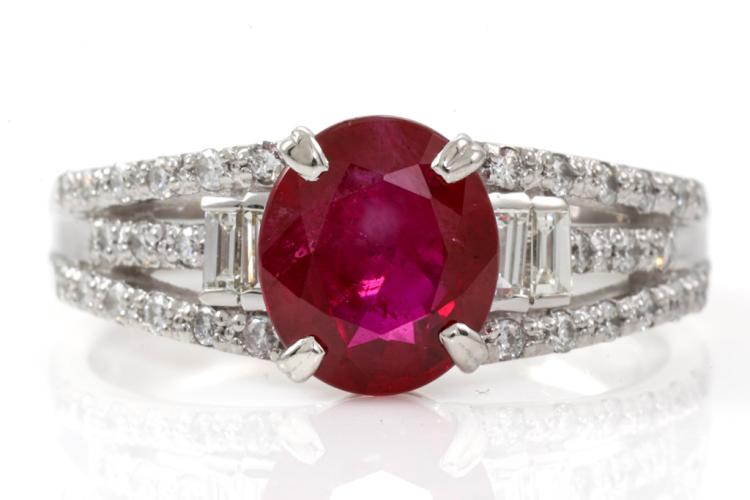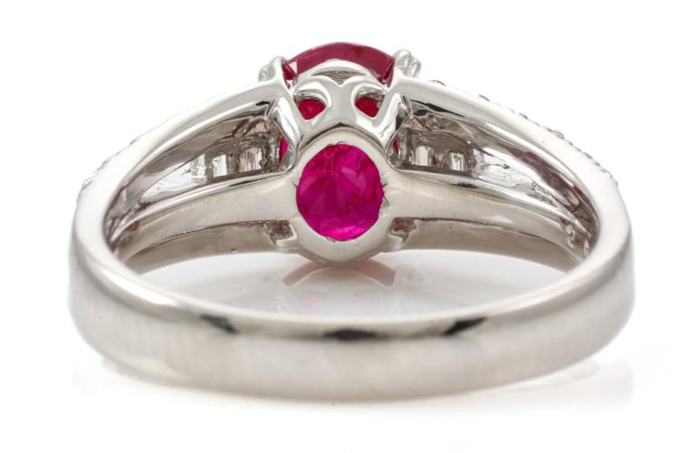 Ruby and Diamond ring with an oval shape Natural Burmese Ruby of 2.01ct and baguette cut & round Natural Diamonds totalling 0.36ct (Estimated grading: GHI SI-P1). Platinum - 900. Ring size M1/2 - ring resizing is not recommended. Weight: 6.2g. With GIA report #5446550738. (Pre-owned)