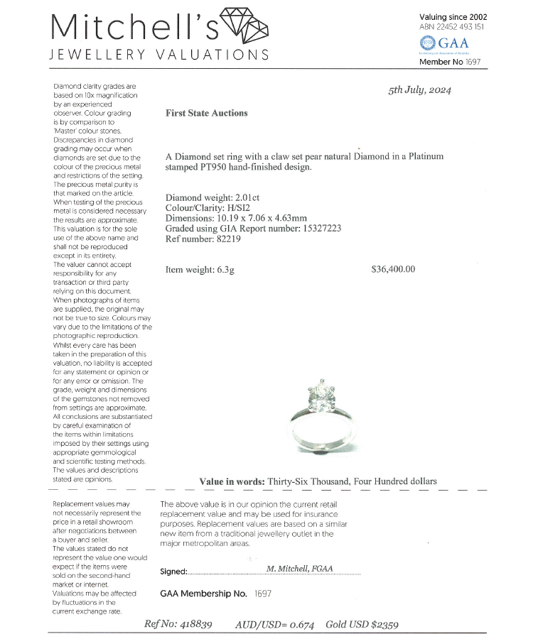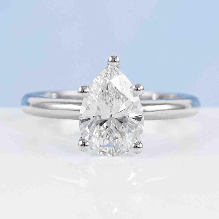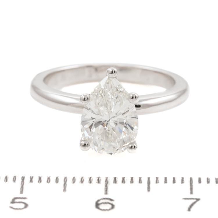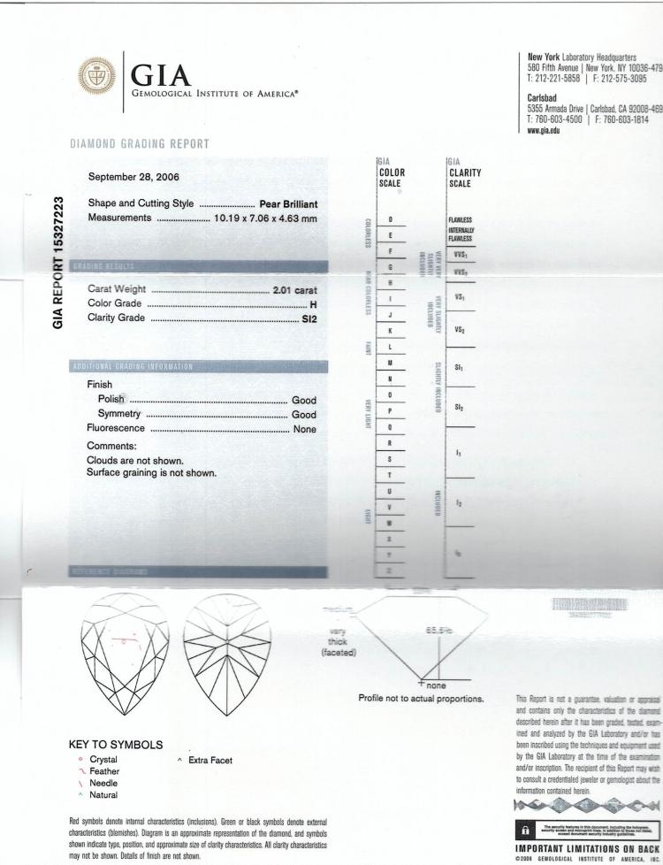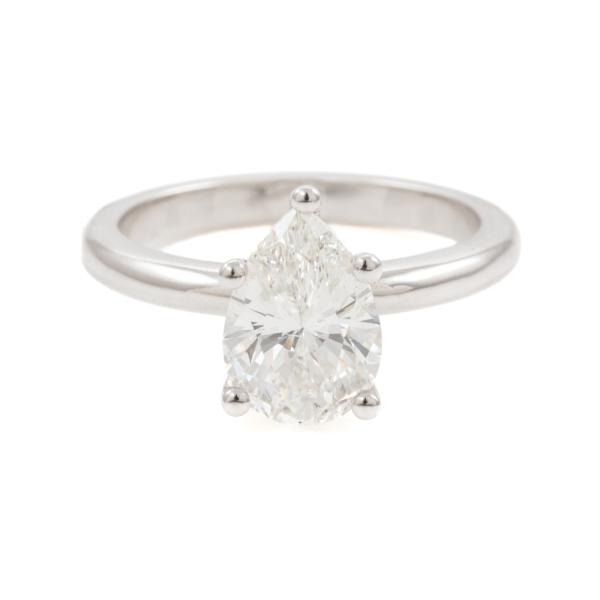 Diamond solitaire ring with pear shape Natural Diamond of 2.01ct (with GIA Report graded as H SI2 #15327223 ) Platinum 950. Ring size: L. Band width: 2.2mm. Weight: 6.3g. With Valuation Certificate #418839. (As New)