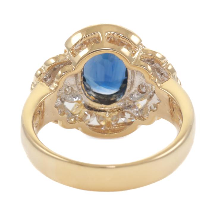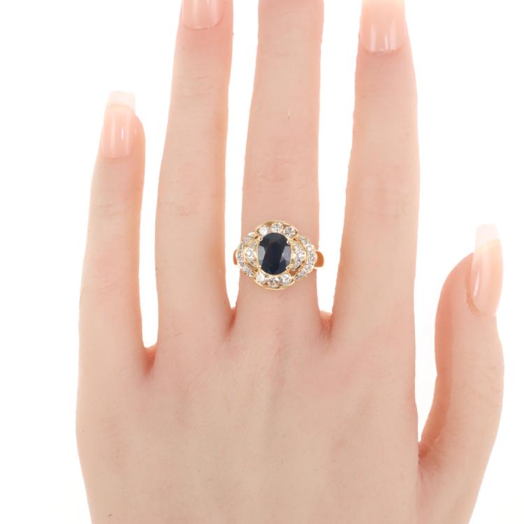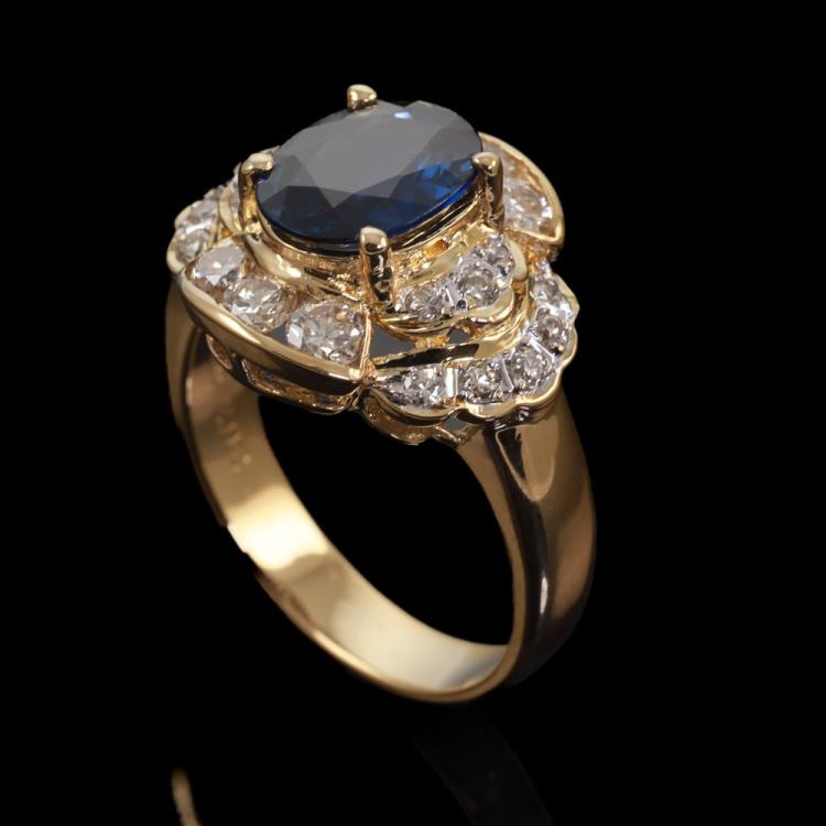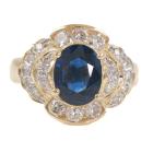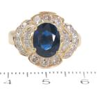 Sapphire and Diamond ring with oval blue Natural Sapphire of 2.02ct with round & baguette cut Natural Diamonds totalling 0.92ct (Estimated grading: I-J SI-P1). 18ct yellow gold. Ring size M. Band width: 3.6mm - 4.1mm. Weight: 7.6g. (As New)