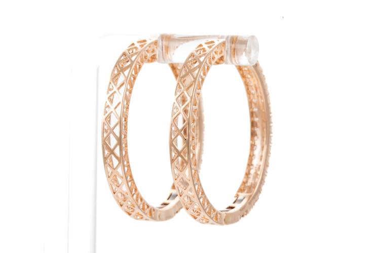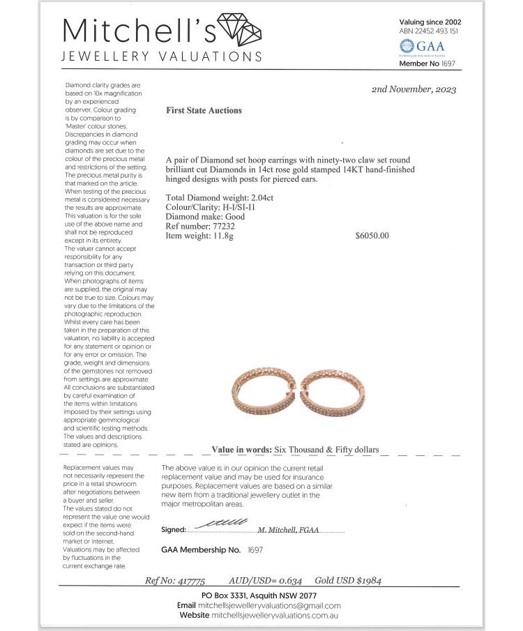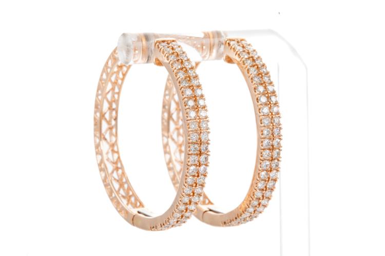 Diamond hoop earrings with 92 round Natural Diamonds totalling 2.04ct (Estimated grading: H-I SI-P1). 14ct rose gold. Weight: 11.8g. With Valuation certificate #417775. (New).