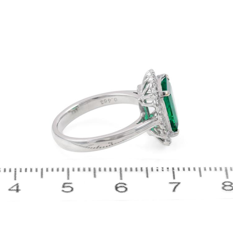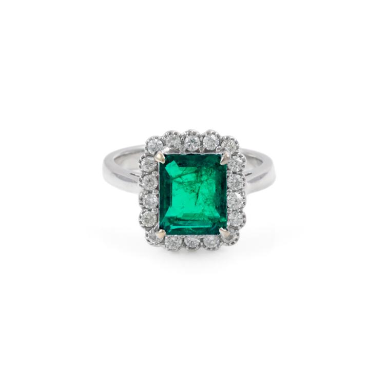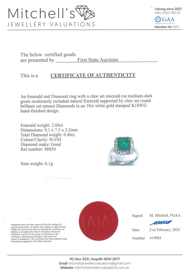 Emerald and Diamond ring with Natural Emerald of 2.04ct and round Natural Diamonds totalling 0.46ct (Estimated grading: H-I SI). 18ct white gold. Ring size M. Band width: 3mm - 2.2mm. Weight: 5.8g. With Certificate #419985. (Pre-owned)