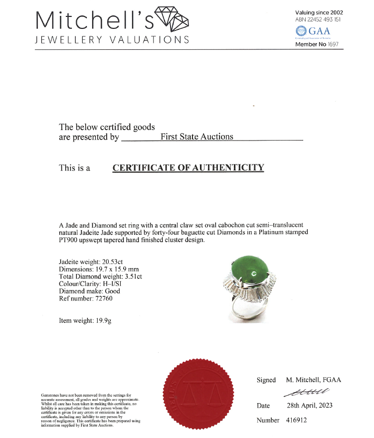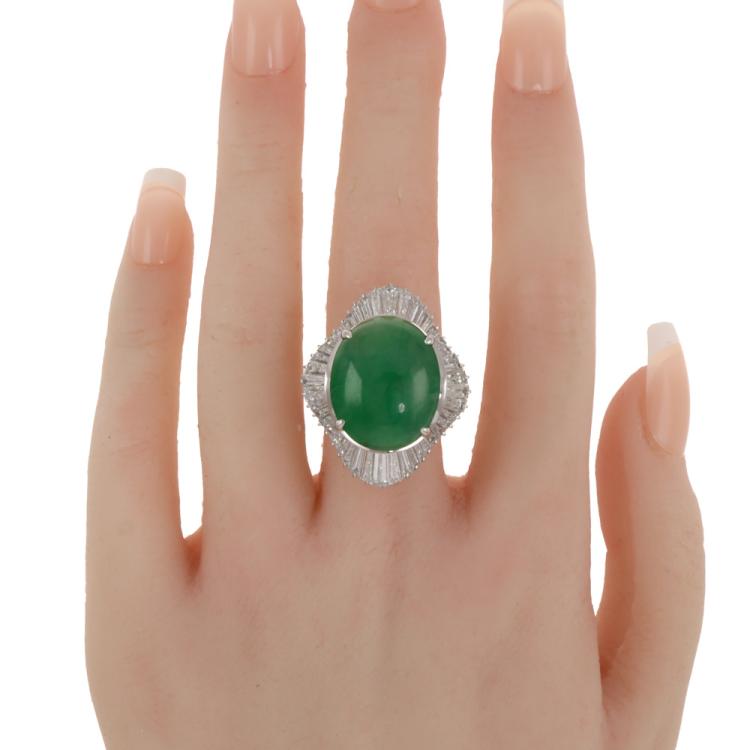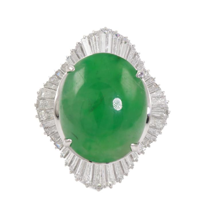 Jade and Diamond ring with cabochon cut oval shape natural Jadeite Jade - Type A of 20.53ct and baguette cut natural Diamonds totalling 3.51ct (Estimated grading: H-I SI). Platinum - 900. Ring size L. Weight: 19.9g. With Certificate #416912. (Pre-owned)