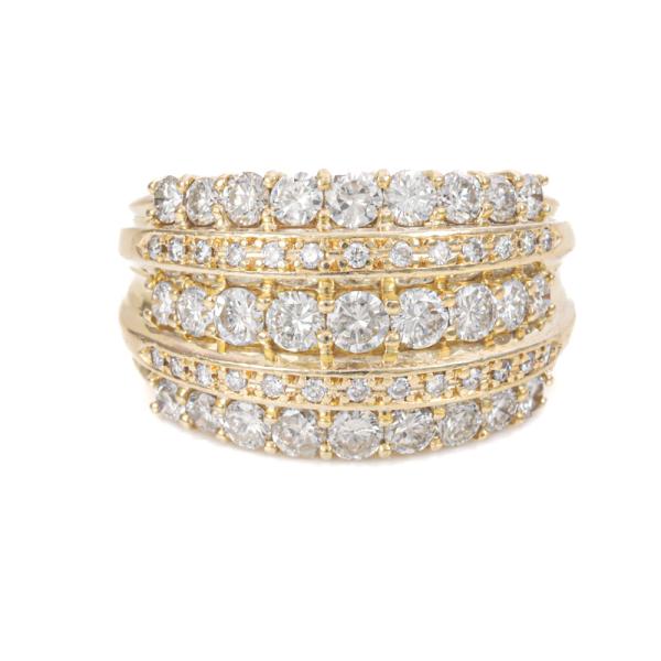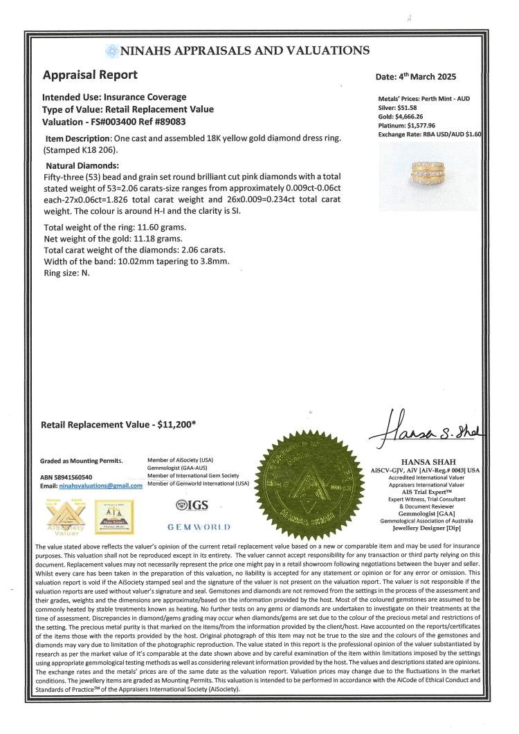 Diamond dress ring with round Natural Diamonds totalling 2.06ct (Estimated grading: H-I SI). 18ct yellow gold. Ring size N. Band width: 10.2mm - 3.8mm. Weight: 11.6g. With Valuation Certificate #003400. (Pre-owned)