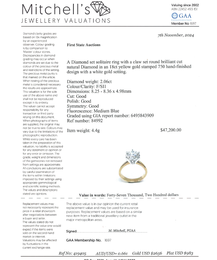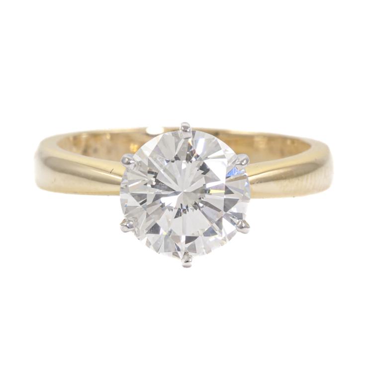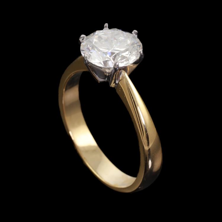 Diamond solitaire ring with round natural brilliant cut Natural Diamond of 2.06ct (With GIA Report graded as F SI1 #6495843909). 18ct yellow and white gold. Ring size L1/2. Band width: 3.2mm - 1.9mm. Weight 4.4g. With Valuation Certificate #419405. (New)