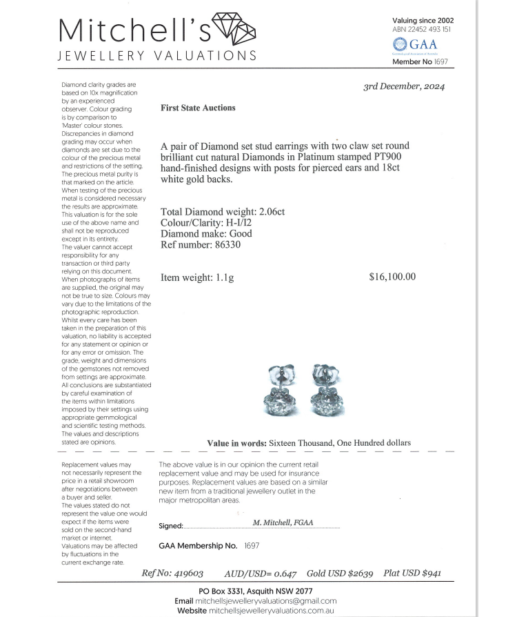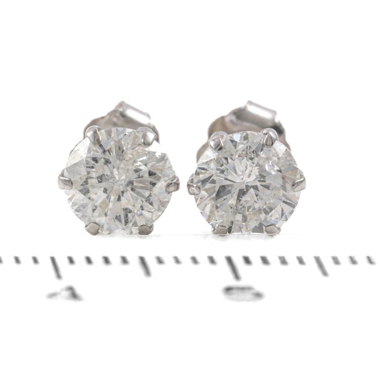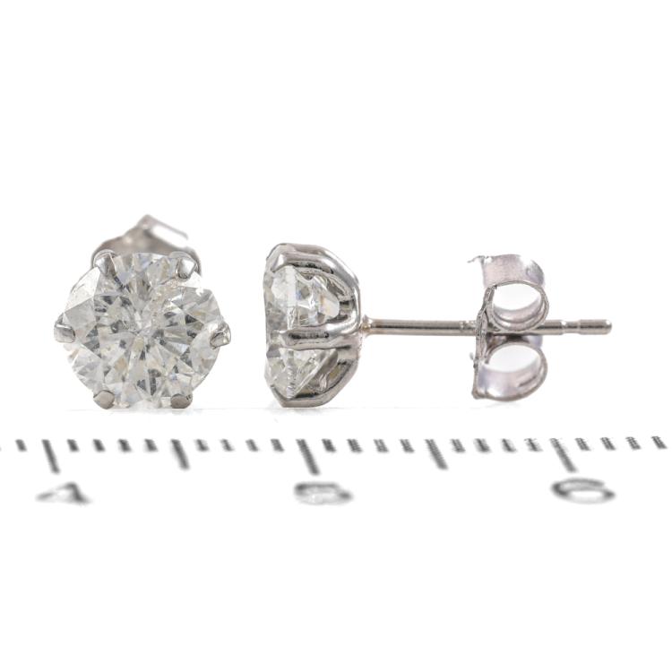 Diamond stud earrings with Natural round Diamonds totalling 2.06ct (Estimated grading: H-I P2). Platinum 900 with 18ct white gold backs. Weight: 1.1g. With Evaluation Certificate #419603. (Pre-owned)
