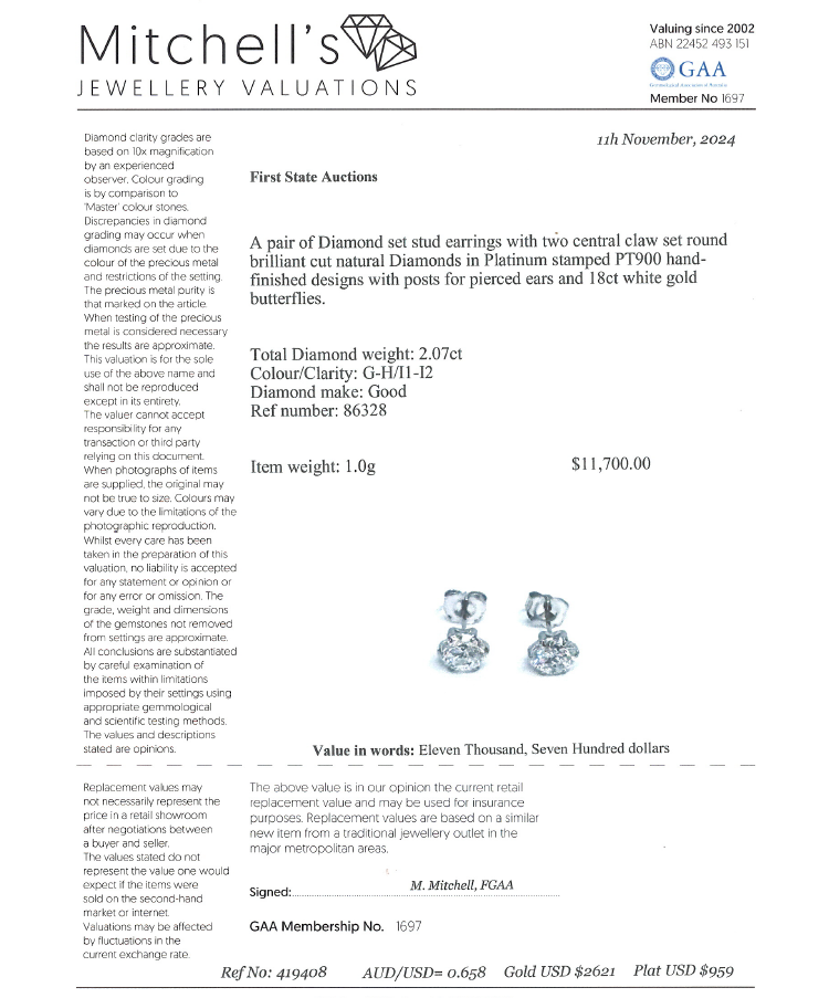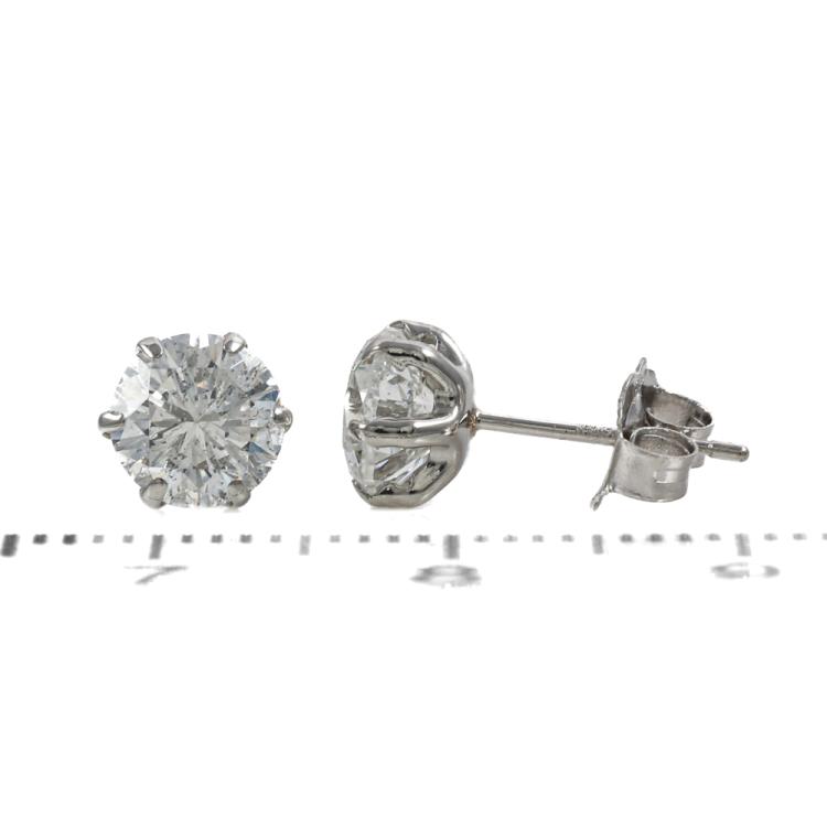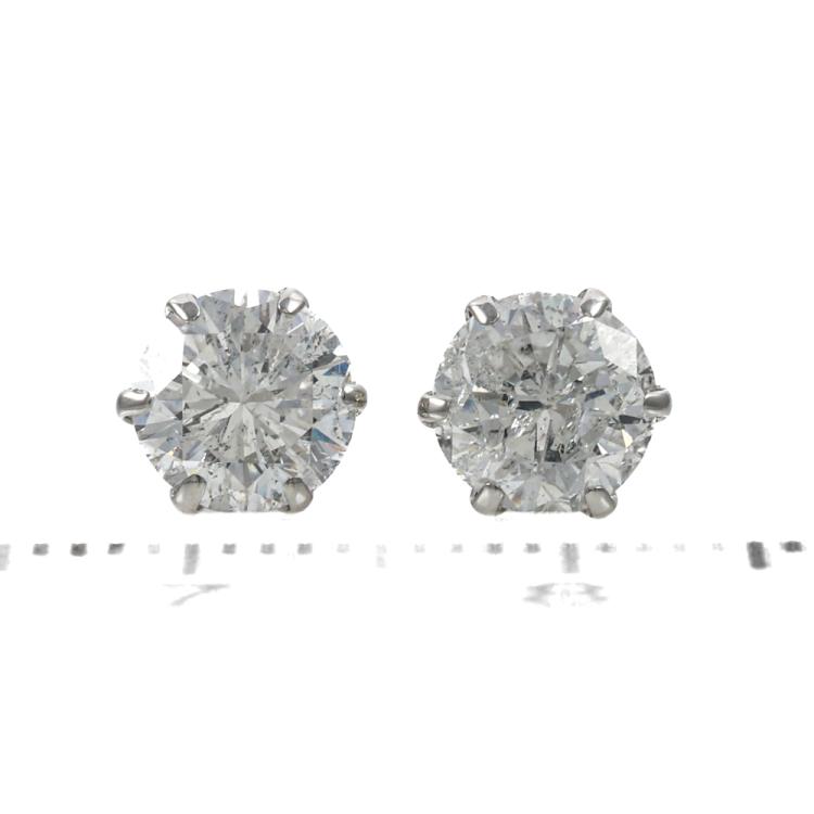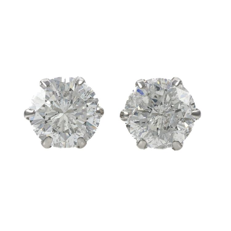 Diamond stud earrings with round Natural Diamonds totalling 2.07ct (Estimated grading: G-H P1-P2). Platinum-900 with 18ct white gold backs. Weight: 1.0g. Valuation Certificate #419408 (Pre-owned)