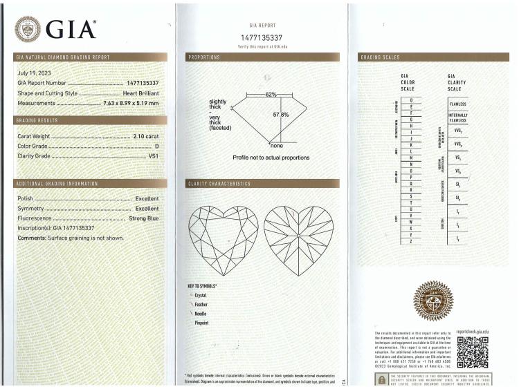 A loose heart shaped Natural Diamond of 2.10ct (With GIA Report graded as D VS1 #1477135337
