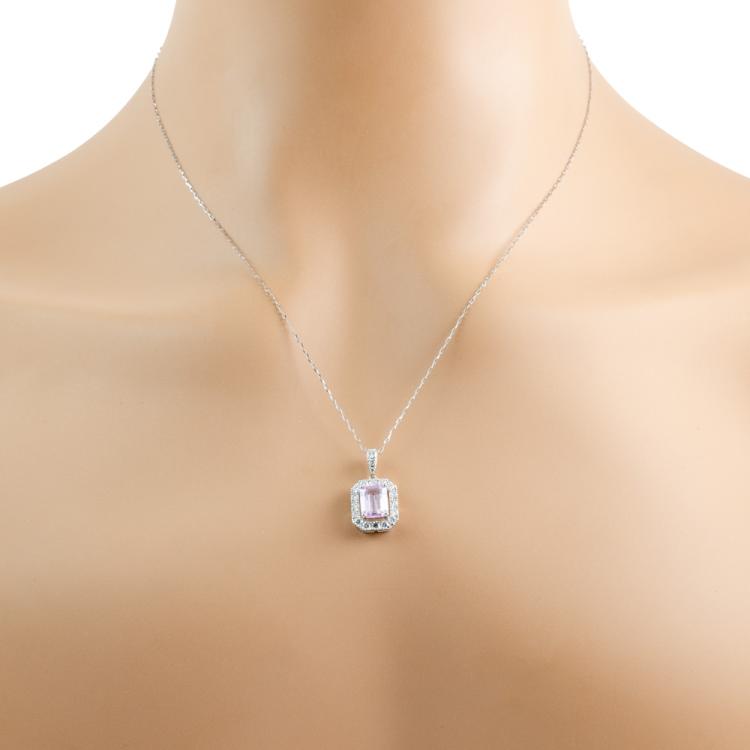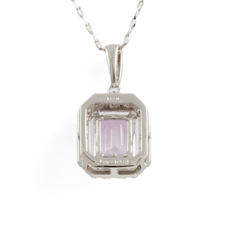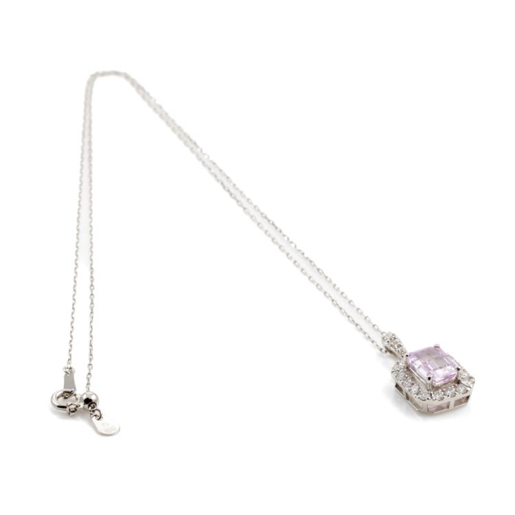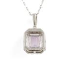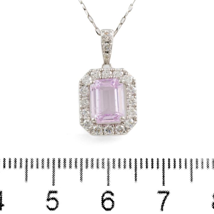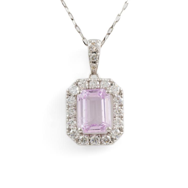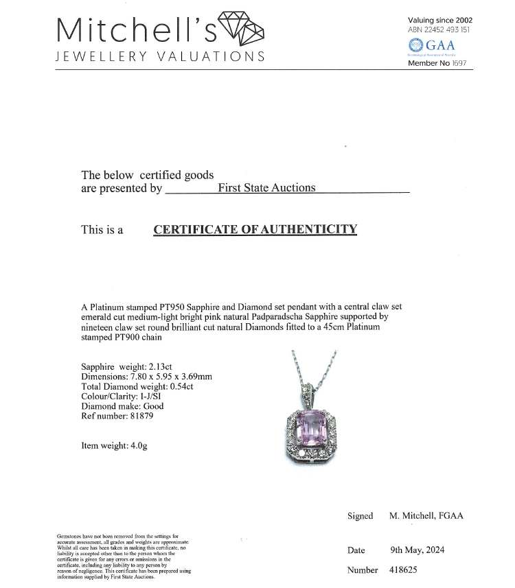 Sapphire and Diamond pendant with an emerald cut Natural pink Padparadscha Sapphire of 2.13ct and round Natural Diamonds totalling 0.54ct (Estimated grading: I-J SI). Platinum 950 with Platinum 900 adjustable 45.0cm chain. Weight: 4.0g. With Certificate #418625. (Pre-owned)