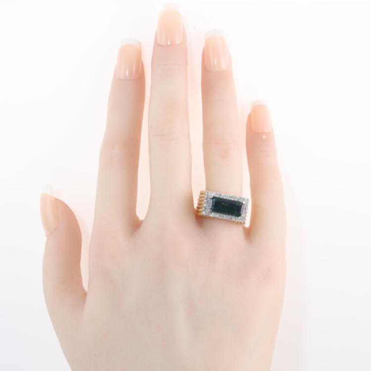 Tourmaline and Diamond ring with an emerald cut green Natural Tourmaline of approximately 2.20ct and round Natural Diamonds totalling approximately 0.30ct (Estimated grading: H-J SI-P1). 14ct yellow & white gold. Ring size K1/2. Band with: 4.5mm. Weight: 10.4g. (Pre-owned)