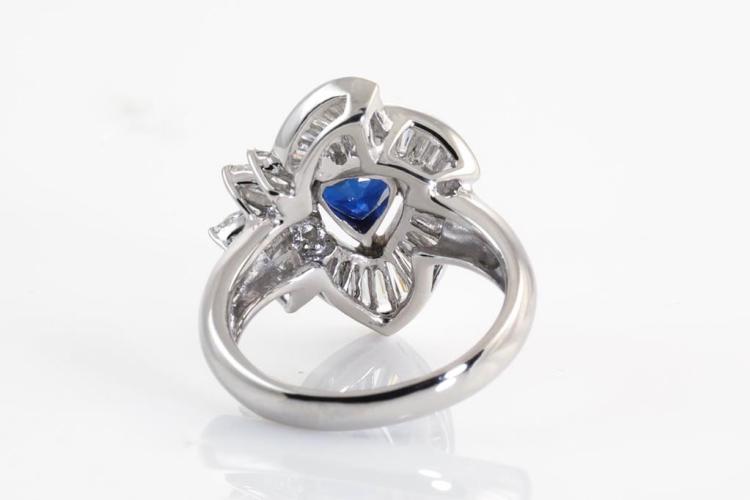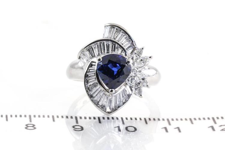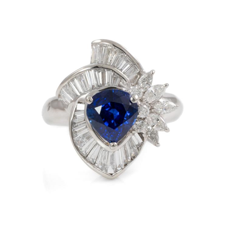 Sapphire and Diamond ring with a pear shape blue Natural Sapphire of 2.21ct (with GIA report #3365727171) and Natural Diamonds totalling 1.50ct (Estimated grading: F VS-SI). Platinum - 900. Ring size M. Band width: 2.9mm - 4.8mm. Weight: 11.0g (Pre-owned)