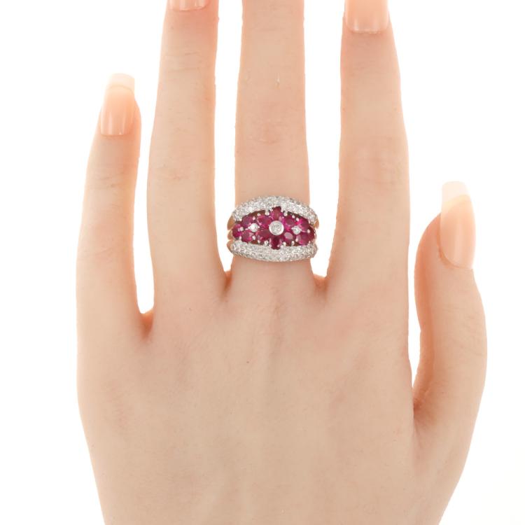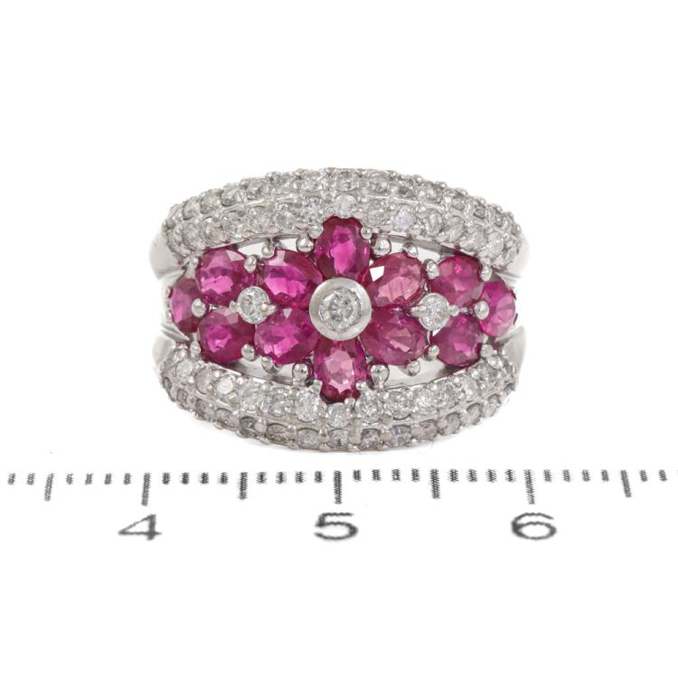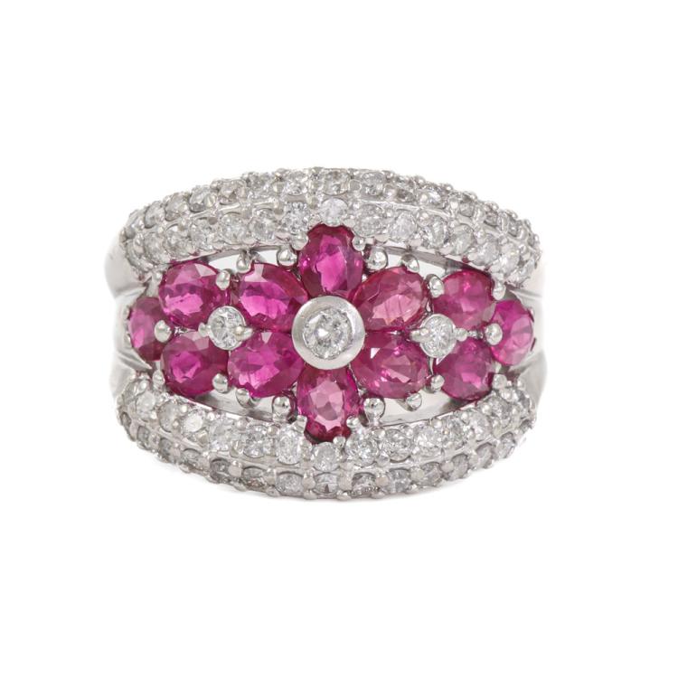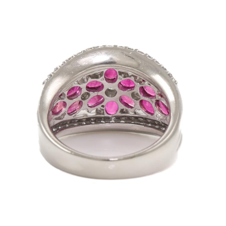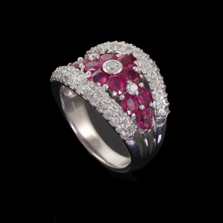 Ruby and Diamond ring with oval shape Natural Rubies totalling 2.23ct and round Natural Diamonds totalling 1.03ct (Estimated grading: H-I SI-P1). Platinum - 900. Ring size L1/4. Band width: 3.7mm - 5.4mm. Weight: 12.5g. (Pre-owned)