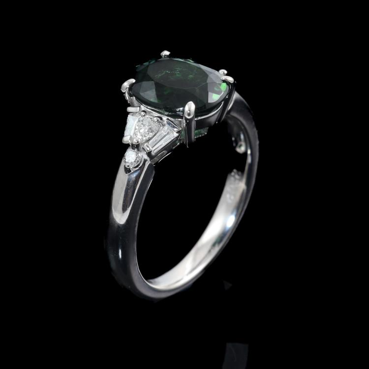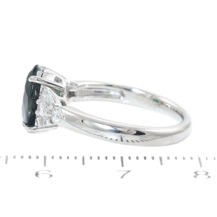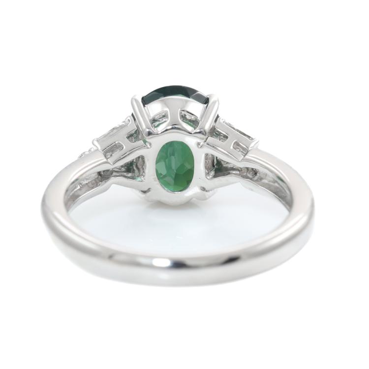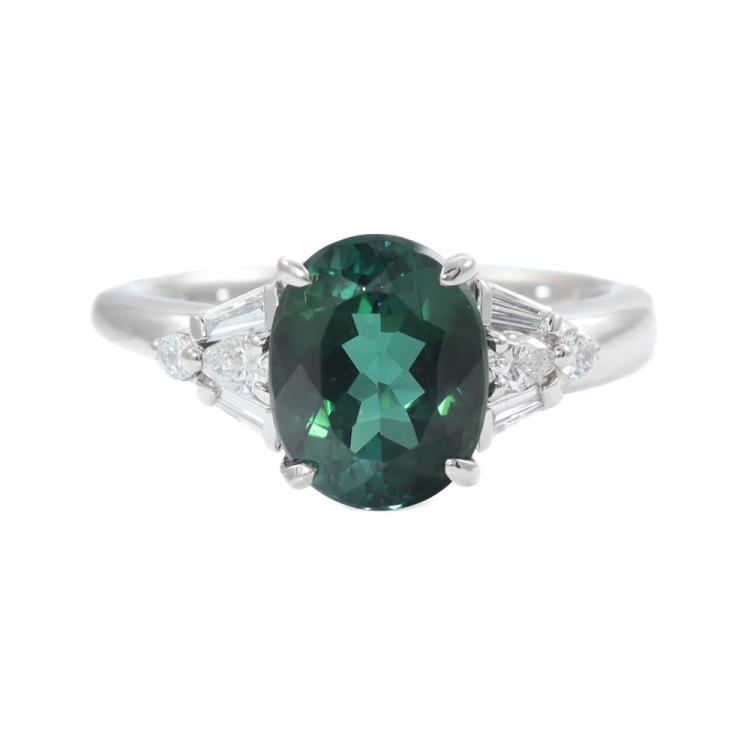 Tourmaline and Diamond ring with oval shape bluish green Natural Tourmaline of 2.26ct and round, pear & baguette cut Natural Diamonds totalling 0.24ct. Platinum - 900. Ring size: K. Band width: 2.4mm -2.9mm. Weight: 5.9g. (Pre-owned)