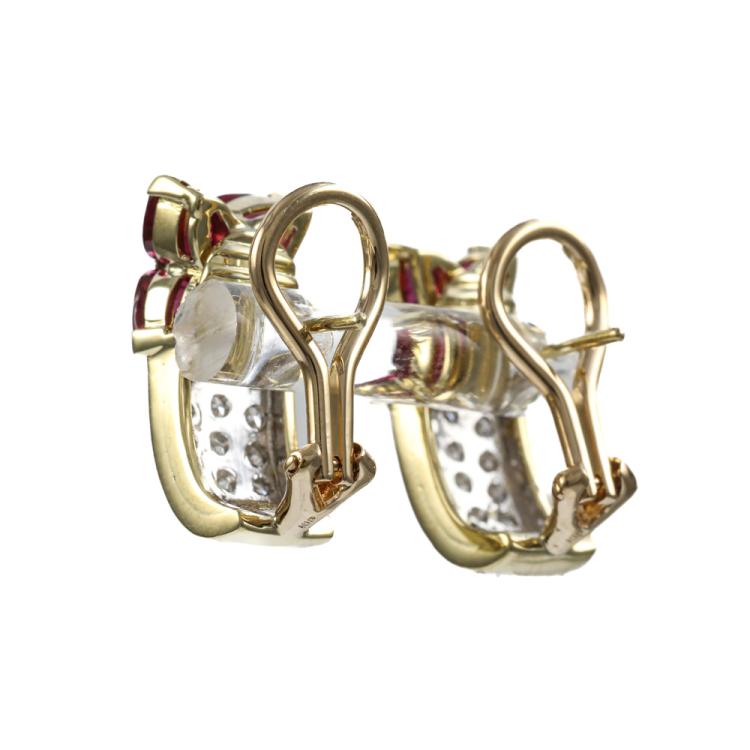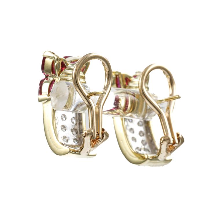 Ruby and Diamond clip-on earrings (for pierced ears) with 8 pear shape Natural Rubies totalling 2.30ct and round Natural Diamonds totalling 0.80cts (Estimated grading: G VS). 18ct yellow gold. Weight: 7.7g. (Pre-owned)