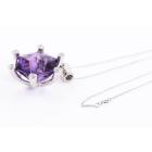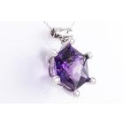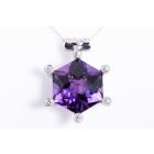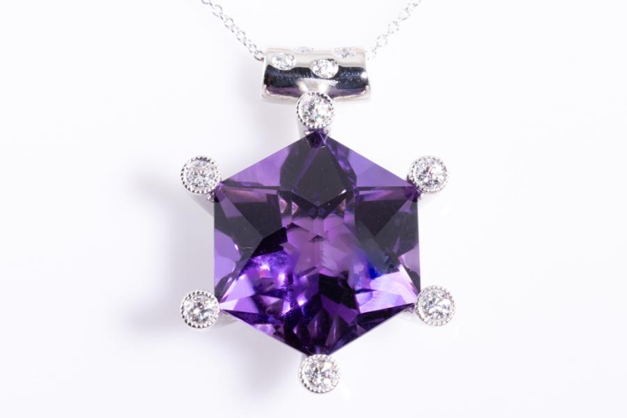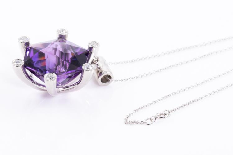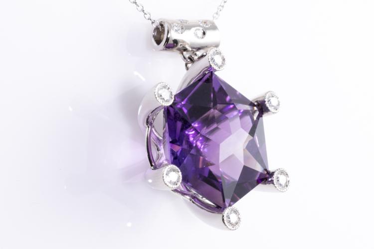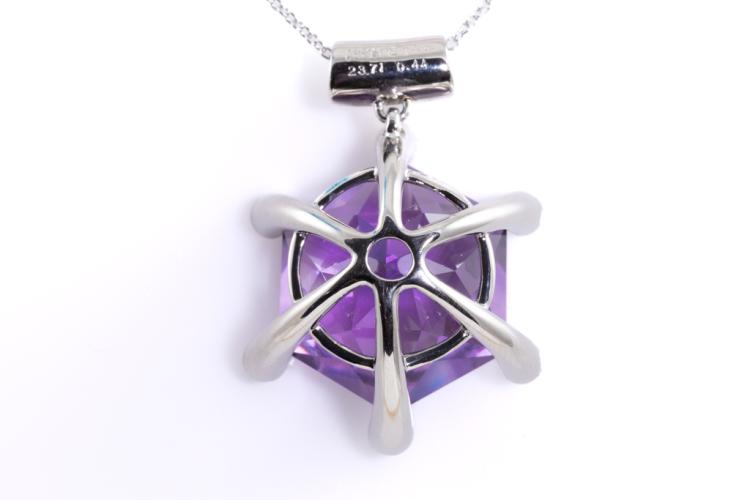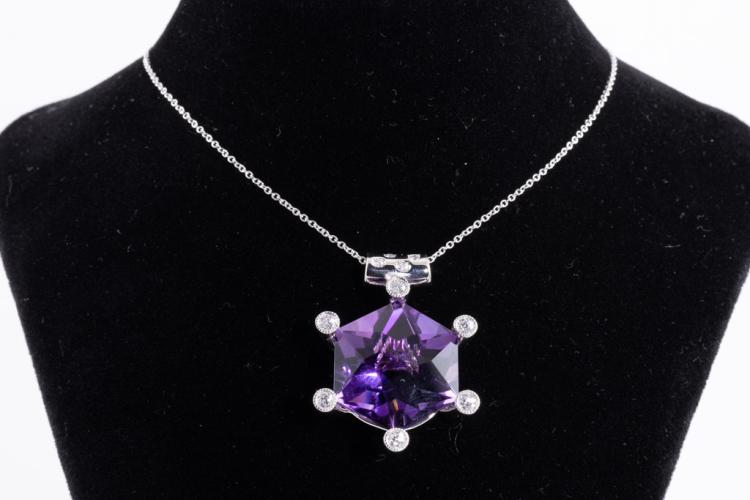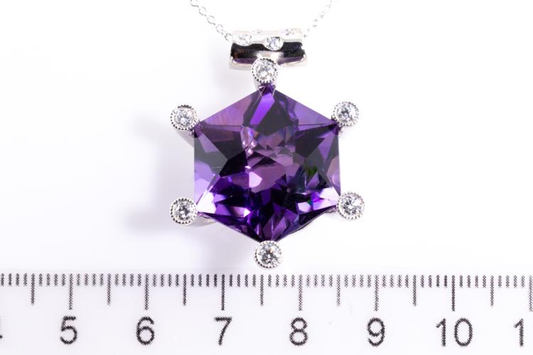 Amethyst and Diamond pendant with hexagonal cut Natural Amethyst of 23.71ct and round Natural Diamonds totalling 0.44ct (Estimated grading: H SI). Platinum - 900 with 40cm 14ct white gold chain. Weight 20.1g. (Pre-owned)