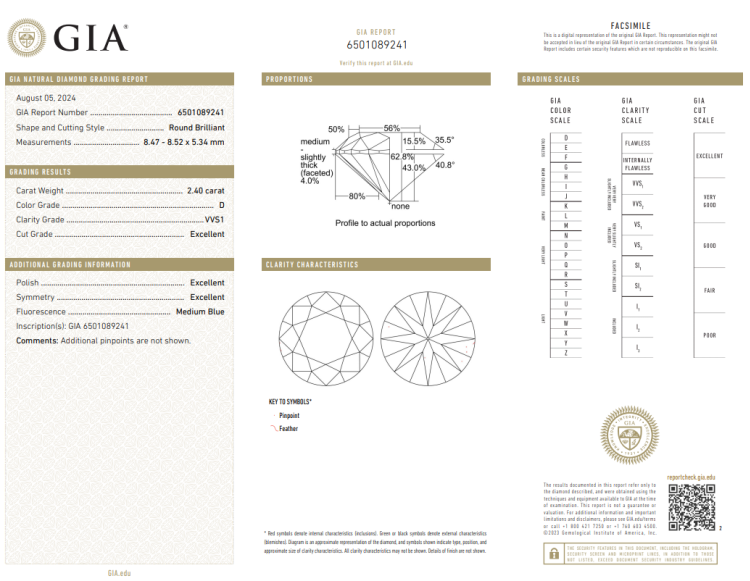 A loose round brilliant cut Natural Diamond of 2.40ct (with GIA report graded as D VVS1 #6501089241). (New)