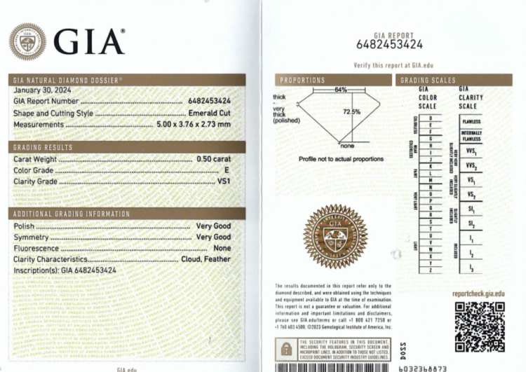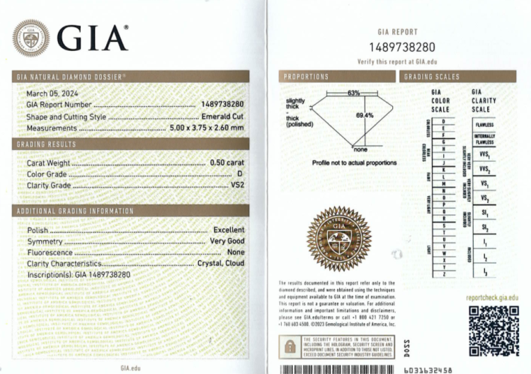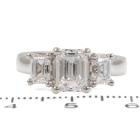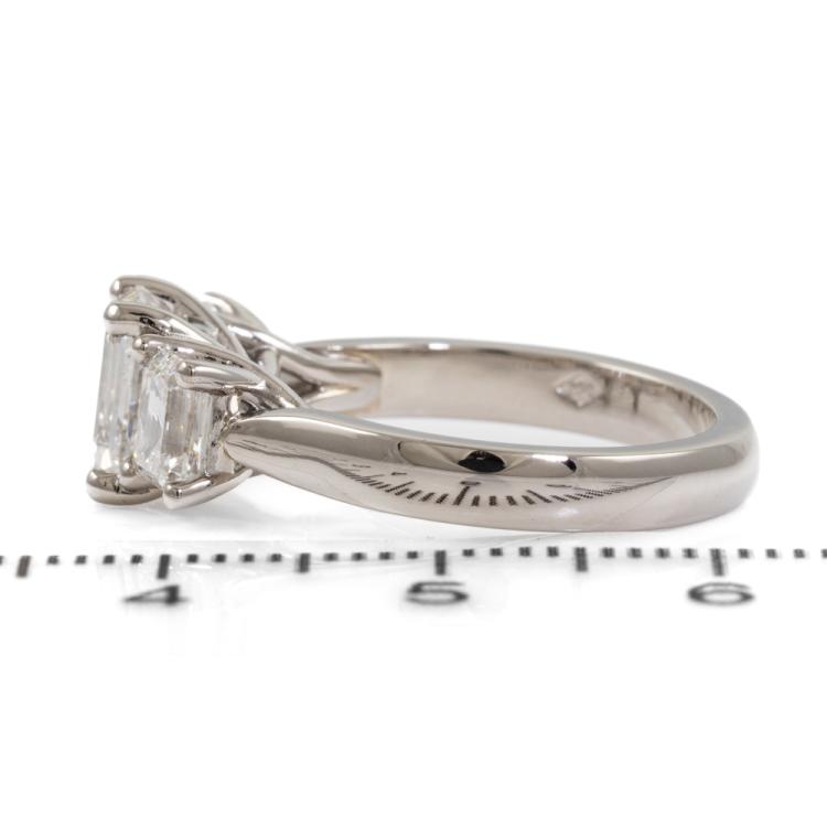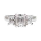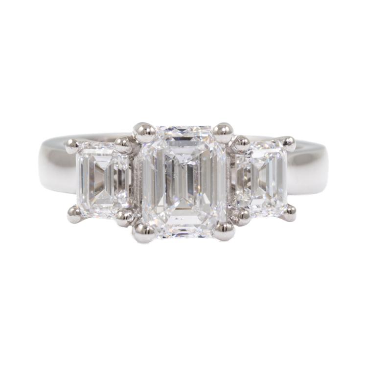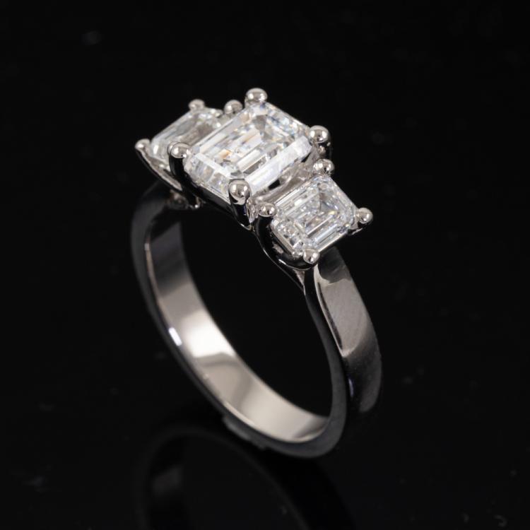 Diamond trilogy ring with centre emerald cut natural Diamond of 1.50ct (with GIA Summary Reports graded as D SI2 #3455722535) and 2 side emerald cut natural Diamonds totalling 1.00ct (with GIA Summary Reports graded as E VS1 #6482453424 and D VS2 #1489738280). Platinum 950. Ring size K. Band width: 3.1mm-2.6mm. Weight: 8.1g. With Valuation Certificate #418786. (New)