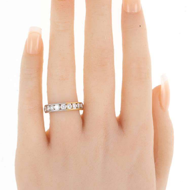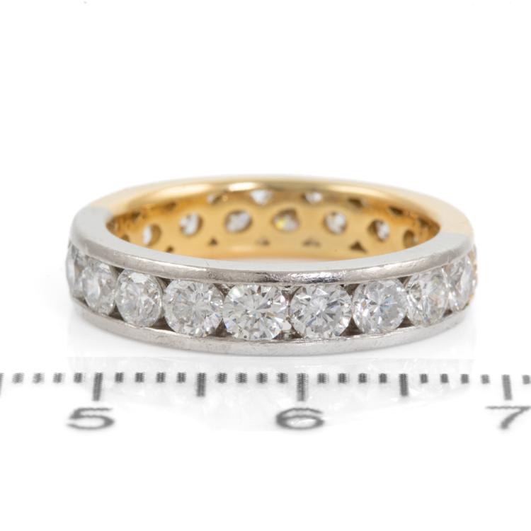 Diamond two-tone full eternity ring with round Natural Diamonds totalling 2.57ct (Estimated grading: H SI). 18ct yellow gold and platinum 900. Ring size L1/2 - ring resizing is not recommended. Band width: 4.5mm. Note - ring band with visible joint lines. Weight: 5.7g. With Valuation Certificate 418374. (Pre-owned)