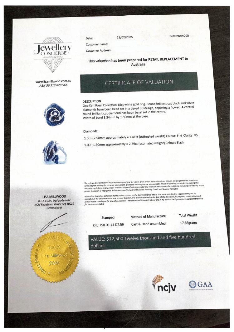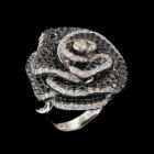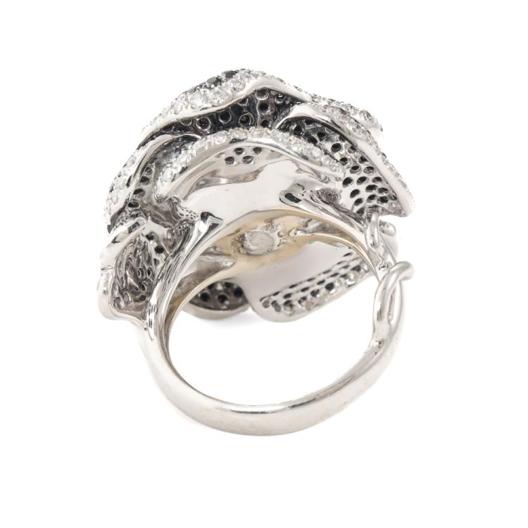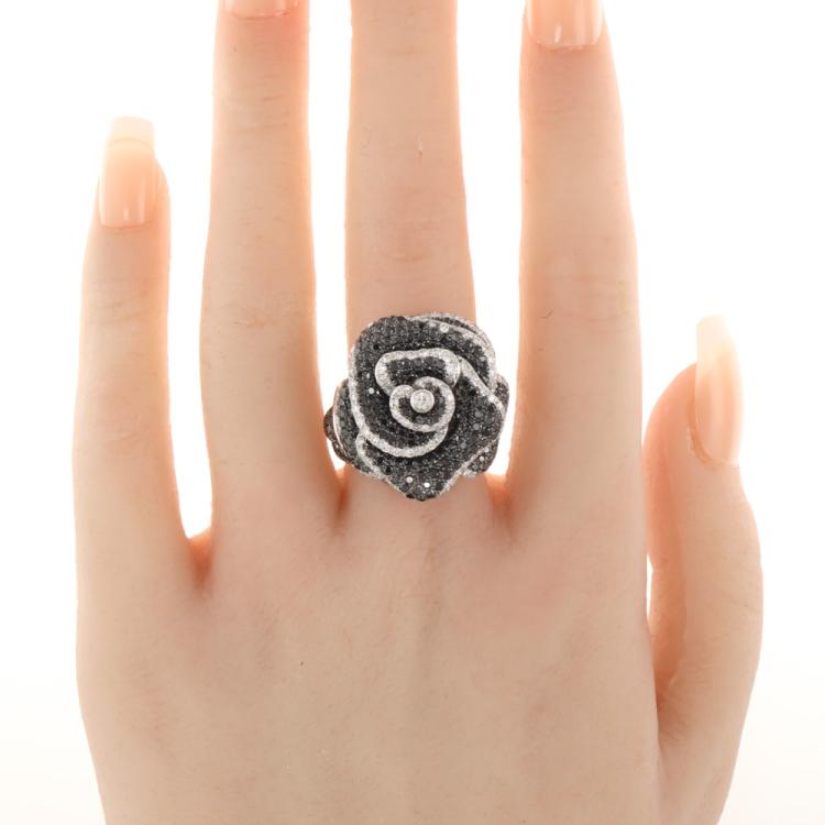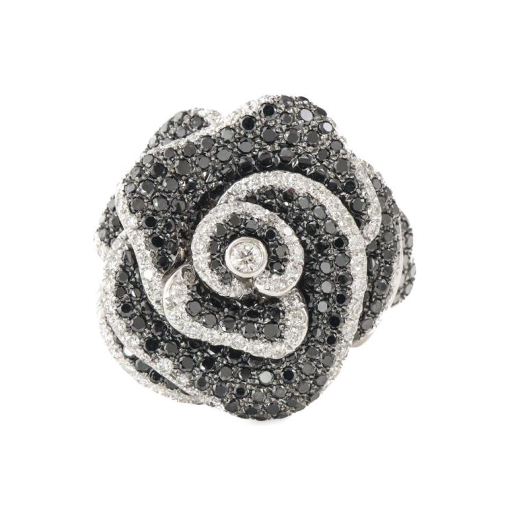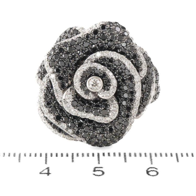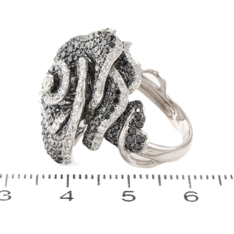 Flower design Diamond ring with round Natural White Diamonds totalling 1.41ct (Estimated grading: F-H VS) and round Natural Black Diamonds totalling 2.59ct (Note, Black Diamond maybe treated). 18ct white gold with black rhodium plating. Ring size I3/4 - ring can be resized up or down by 2 sizes. Band width: 3.4mm - 2.8mm. Engraved with "KRC" - Karl Rossi Collection. Weight: 17.6g. With copy of Valuation Certificate dated 21/2/2025. (Pre-owned)
