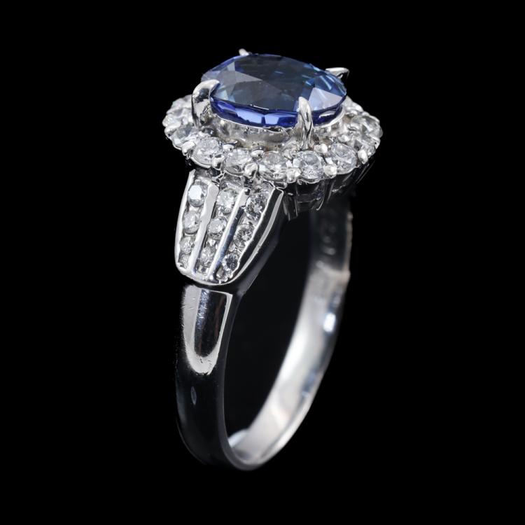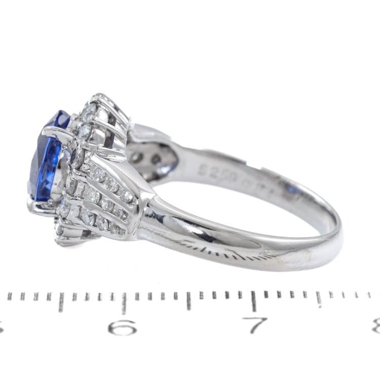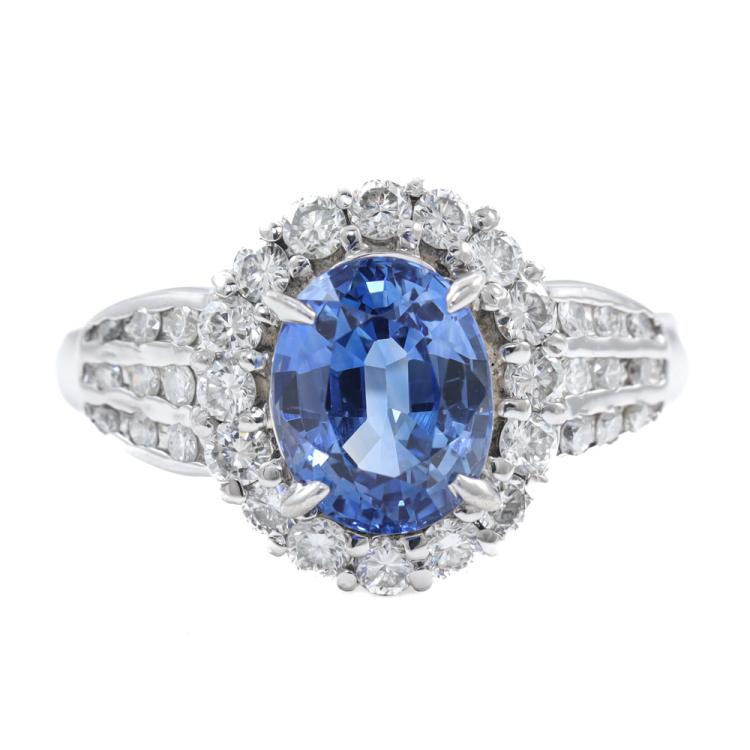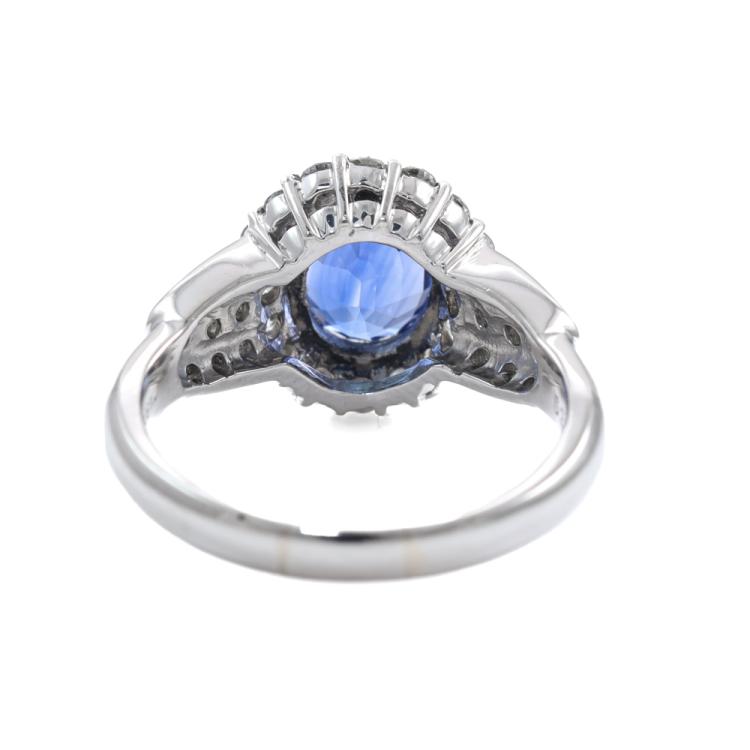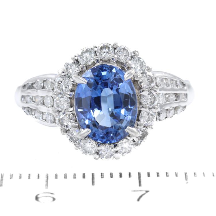 Sapphire and Diamond ring with oval shape Natural blue Sapphire of 2.59ct and round Natural Diamonds totalling 0.72ct (Estimated grading: G-H SI). Platinum 900. Ring size O 3/4. Band width: 2.6mm - 3.3mm. Weight: 8.5g. (Pre-owned)
