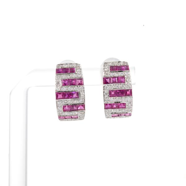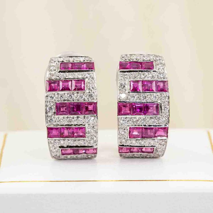 Ruby and Diamond clip-on earrings (for pierced ears) with carre cut Natural Rubies totalling 2.72ct and round Natural Diamonds totalling 0.50ct (Estimated grading: G-H SI). 18ct white gold and silicon. Weight: 7.5g. (Pre-owned)