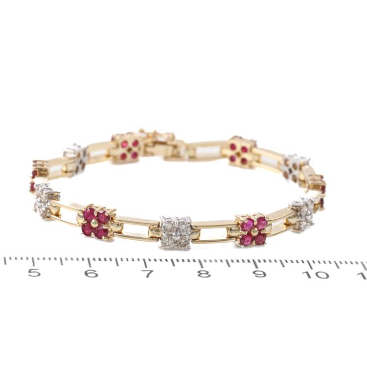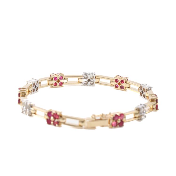 Ruby and Diamond bracelet with round Natural Rubies totalling 2.80ct and round Natural Diamonds totalling 1.27ct (Estimated grading: J VS). 18ct yellow gold. Length: 17cm, Weight: 16.3g. With Certificate #419766. (Pre-owned)
