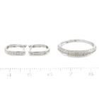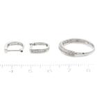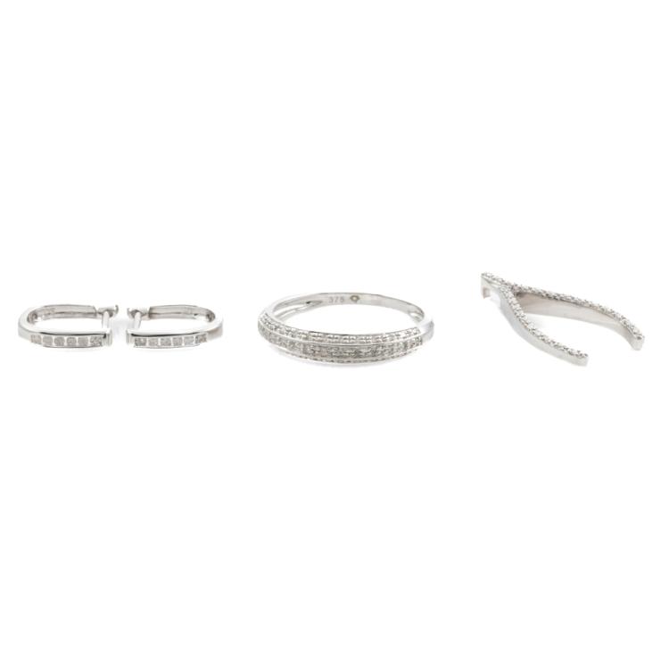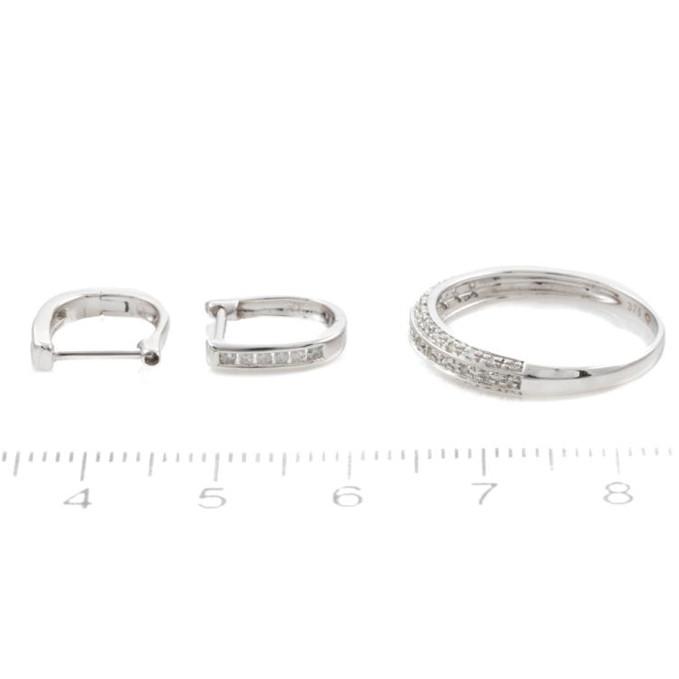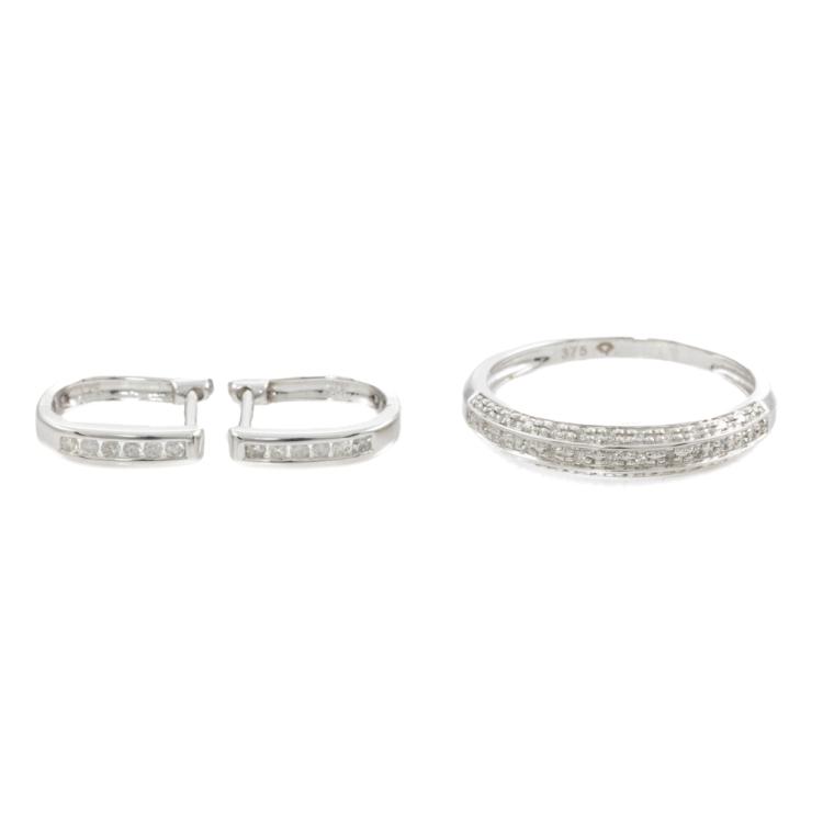 3 piece set: 1) Diamond dress ring with round Natural Diamonds totalling 0.10ct. 9ct white gold. Ring size N - ring resizing is not recommended. 2) Diamond pendant with round natural Diamonds totalling 0.10ct. 9ct white gold. No chain provided. 3) Diamond huggie earrings with round Natural Diamonds totalling 0.10ct. 9ct white gold. Combined weight of 4.2g. (As new)