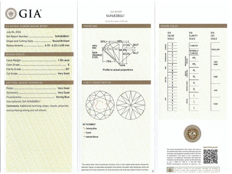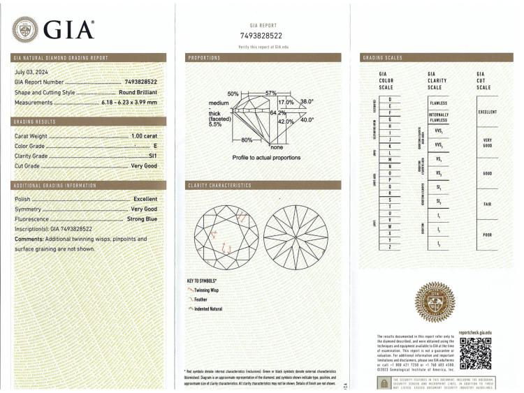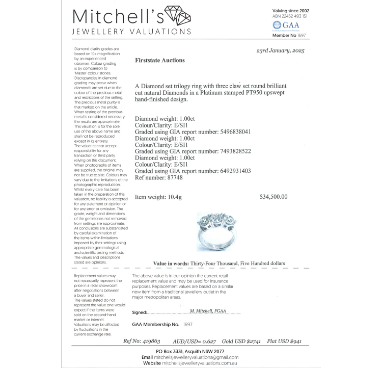 Diamond trilogy ring with 3 round brilliant cut Natural Diamonds totalling 3.00cts (with GIA Reports graded as E SI1 #5496838041, 7493828522, 6492931403). Platinum 950. Ring size: L. Band width: 3.3mm -3.8mm. Weight: 10.4g. With Valuation Certificate #419863. (New)